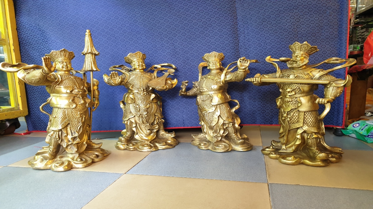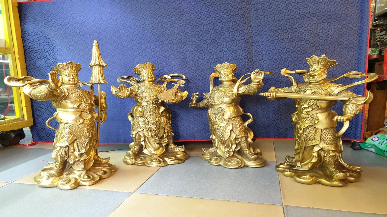 Mỗi khi chúng ta đi tới gần một ngôi chùa Phật thì điều đầu tiên trông thấy là điện thờ Thiên vương. Tại đây, người ta thờ bốn vị vũ tướng nom rất uy vũ hùng tráng. Một vị mặc áo xanh, tay cầm thanh bảo kiếm, một vị mặc đại bào màu trắng, tay ôm cây đàn tì bà, một vị mặc đại bào màu lục, tay cầm cây dù nạm ngọc trai, một vị mặc áo đại bào màu đỏ có con rồng quấn trên tay.Bốn vị này là “Tứ đại Thiên vương” mà dân gian thường gọi là “Tứ đại Kim cương”. Điện Thiên vương chính là ban Cảnh vệ bảo vệ chùa. Các Thiên vương ngoài việc giữ gìn Phật pháp còn có trách nhiệm trông nom bốn phương cho mưa thuận gió hoà. Vì thế các Thiên vương cũng được gọi là “Hộ thế Thiên tôn”.