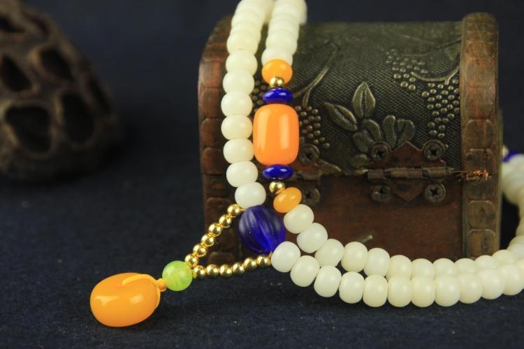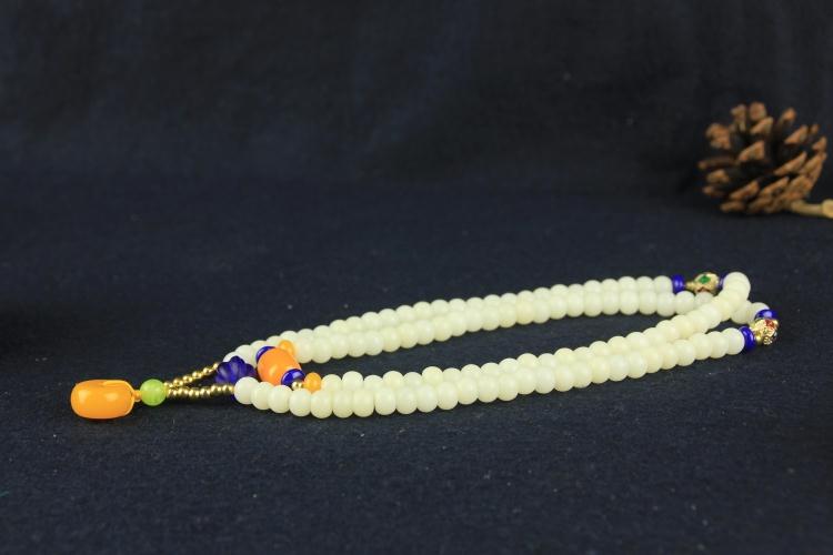 Tràng hạt 108 hạt Bạch Ngọc Trai  khi niệm phật là quyết tâm đoạn trừ 108 món phiền não mà mình đã tạo trong ba đời. Đoạn trừ 108 món phiền não cũng có nghĩa là làm cho sáu căn thanh tinh. Phật giáo Việt Nam thì giải thích là khi lục căn (Mắt, mũi, lưỡi, thân và ý) không thanh tịnh vì thiếu lục thức (nhãn thức, nhĩ thức, tỷ thức, thiệt thức, thân thức và ý thức) thì dễ bị giao động bởi lục trần(sắc, thanh, hương, vị, xúc và pháp). Sáu căn, sáu trần, và sáu thức cộng lại, thành thập bát giới (18). Con số này nhân cho 6 phiền não căn bản (tham, sân, si, mạn, nghi, ác kiến) thì là số thành 108 (18x6=108)