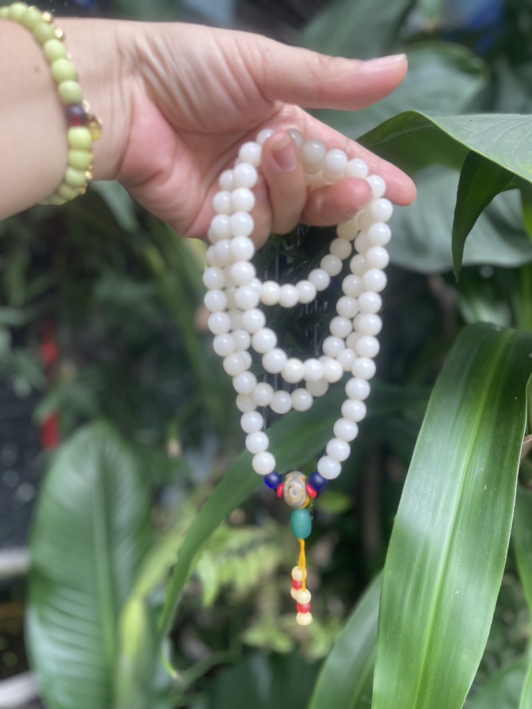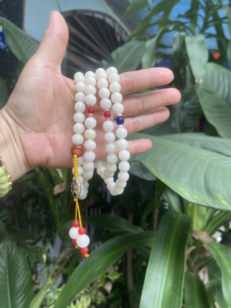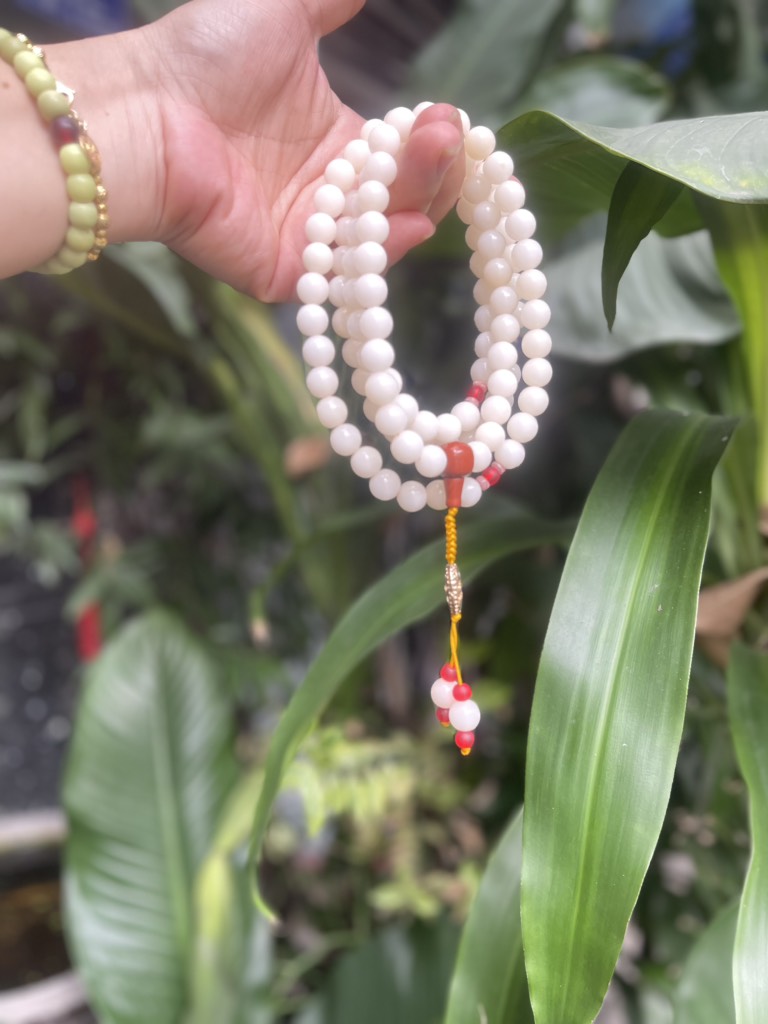 Tràng hạt 108 hạt Bạch Ngọc Trai khi niệm phật là quyết tâm đoạn trừ 108 món phiền não mà mình đã tạo trong ba đời. Đoạn trừ 108 món phiền não cũng có nghĩa là làm cho sáu căn thanh tinh. Phật giáo Việt Nam thì giải thích là khi lục căn (Mắt, mũi, lưỡi, thân và ý) không thanh tịnh vì thiếu lục thức (nhãn thức, nhĩ thức, tỷ thức, thiệt thức, thân thức và ý thức) thì dễ bị giao động bởi lục trần(sắc, thanh, hương, vị, xúc và pháp). Sáu căn, sáu trần, và sáu thức cộng lại, thành thập bát giới (18). Con số này nhân cho 6 phiền não căn bản (tham, sân, si, mạn, nghi, ác kiến) thì là số thành 108 (18x6=108)