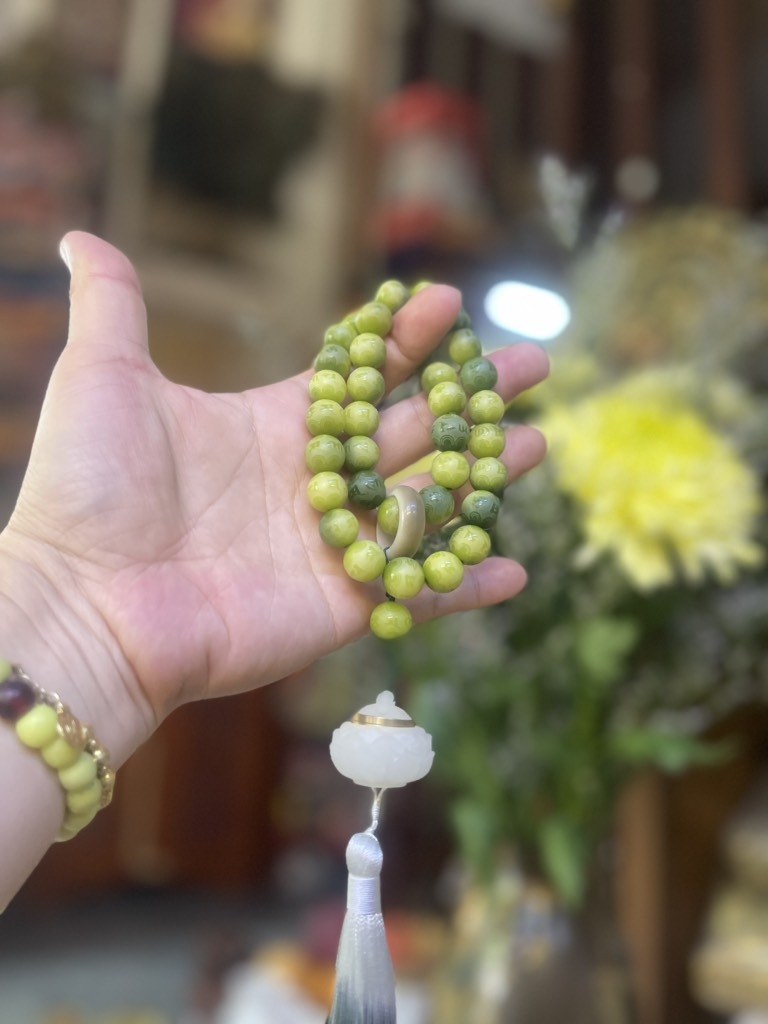 Chuỗi Bạch Ngọc Trai Xanh -Cầm Tay Khắc Thần Chú OmMaNi Tua Hoa Sen 12 ly-36 gr