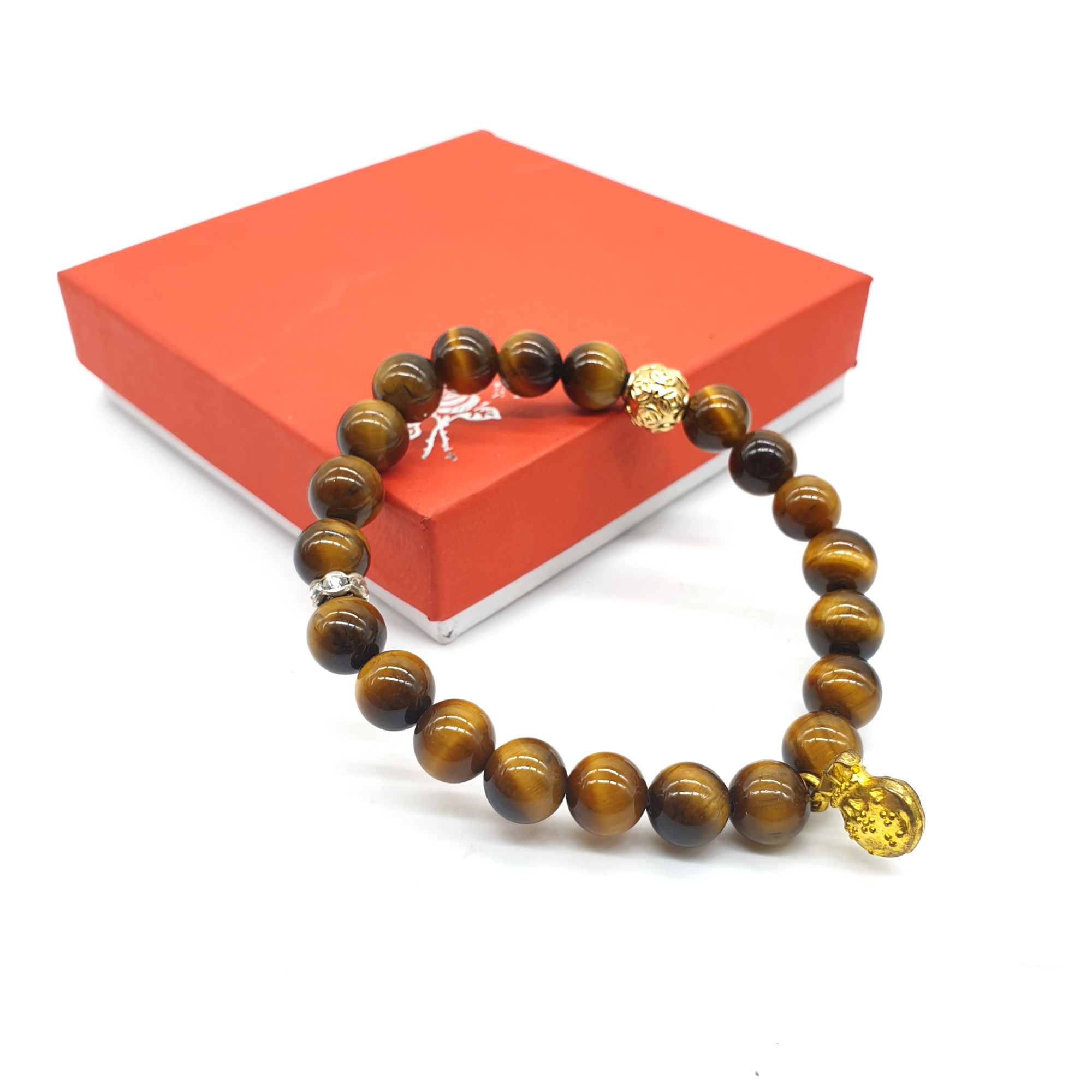 Vòng tay đá mắt hổ vàng nâu đây là loại biến thể phổ biến nhất trong tự nhiên. Màu nâu vàng trong phong thủy ngũ hành thuộc hành Thổ. Bởi thế, vòng đá mắt hổ vàng nâu sẽ phù hợp với những người mệnh Thổ và mệnh Kim.