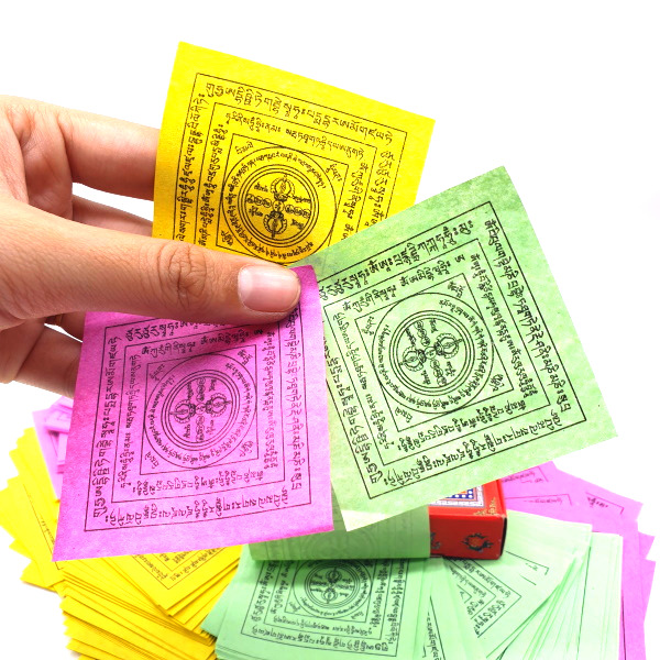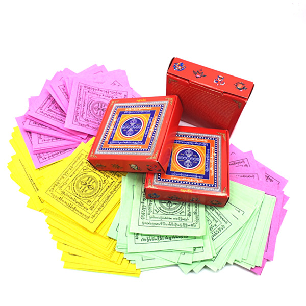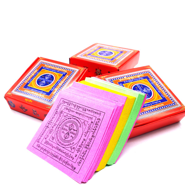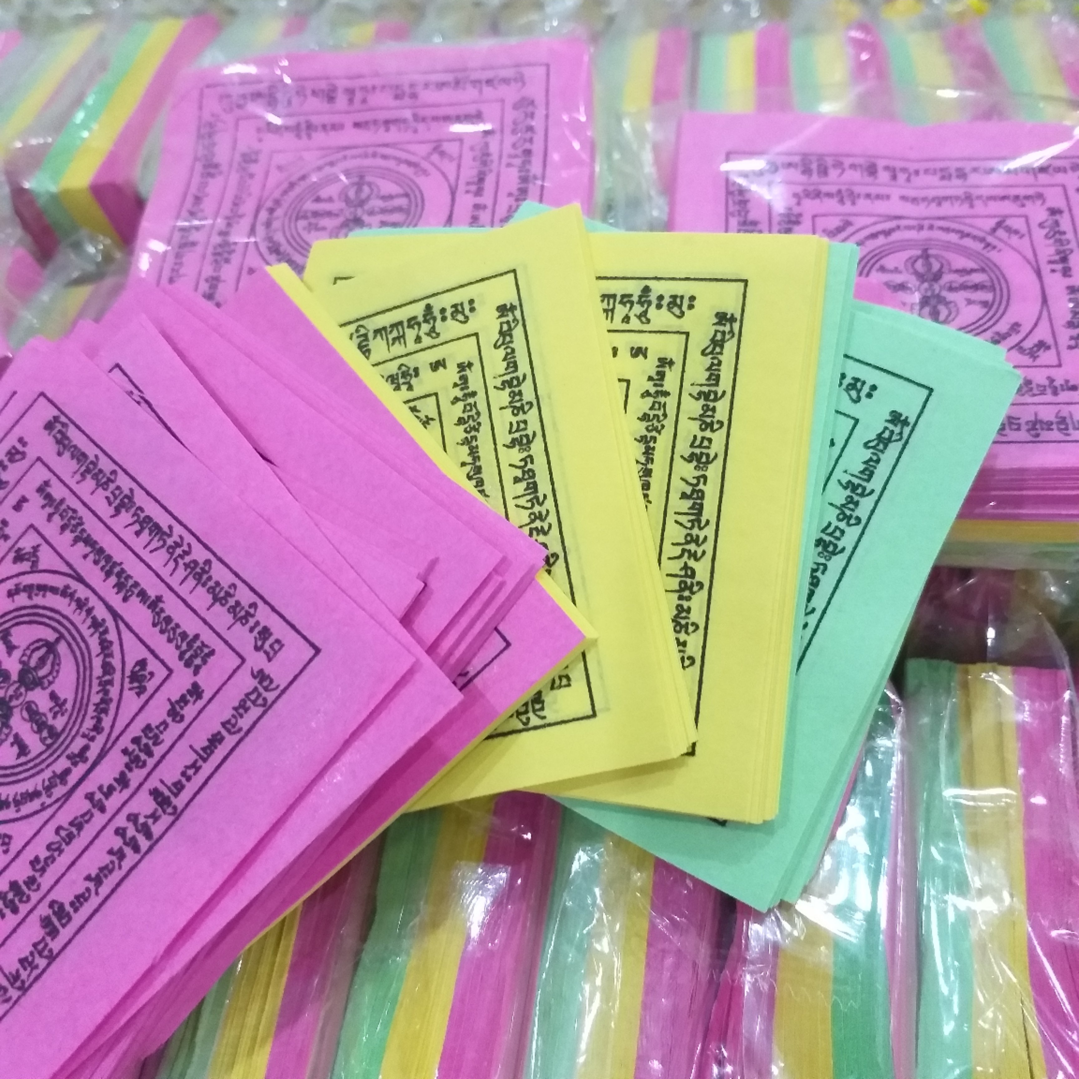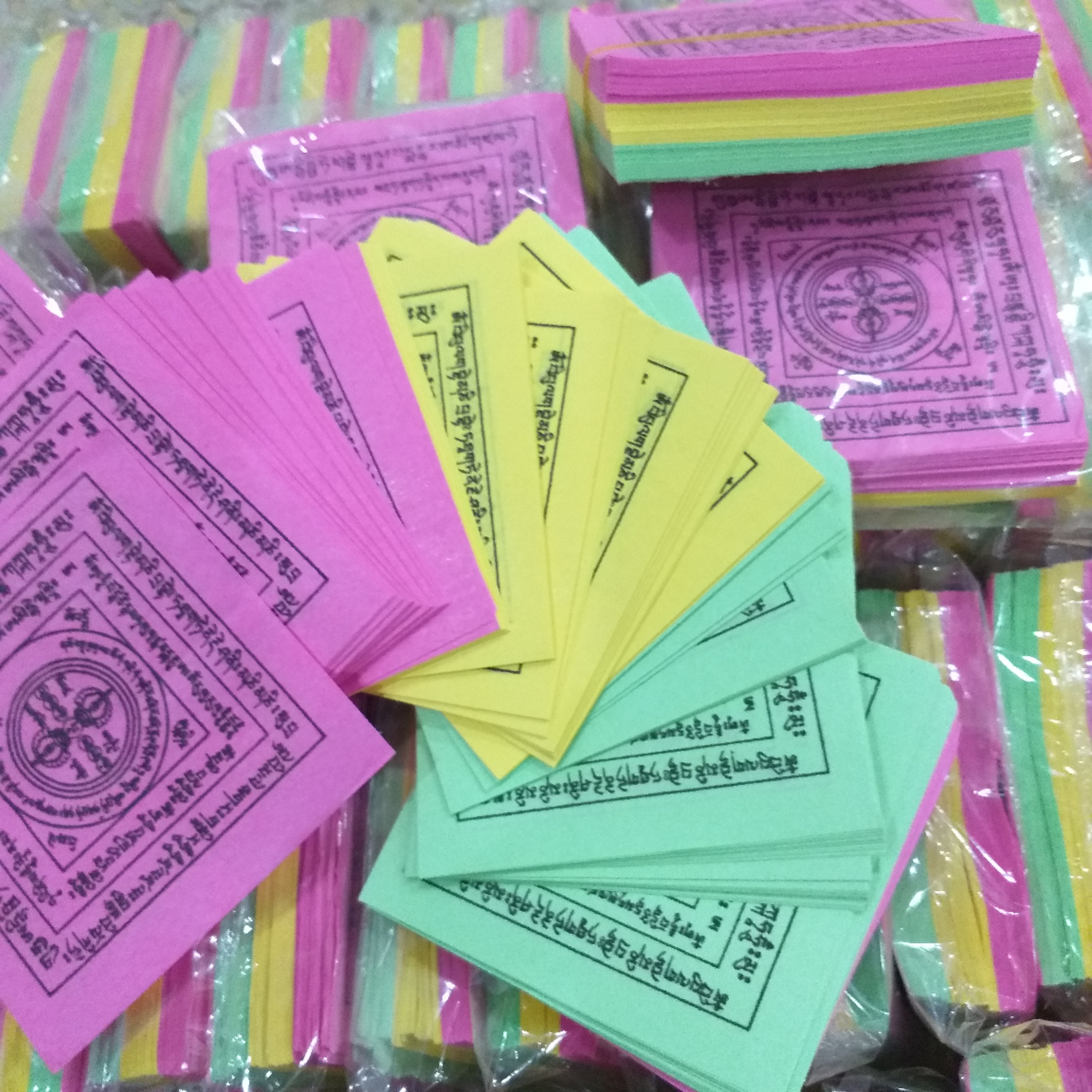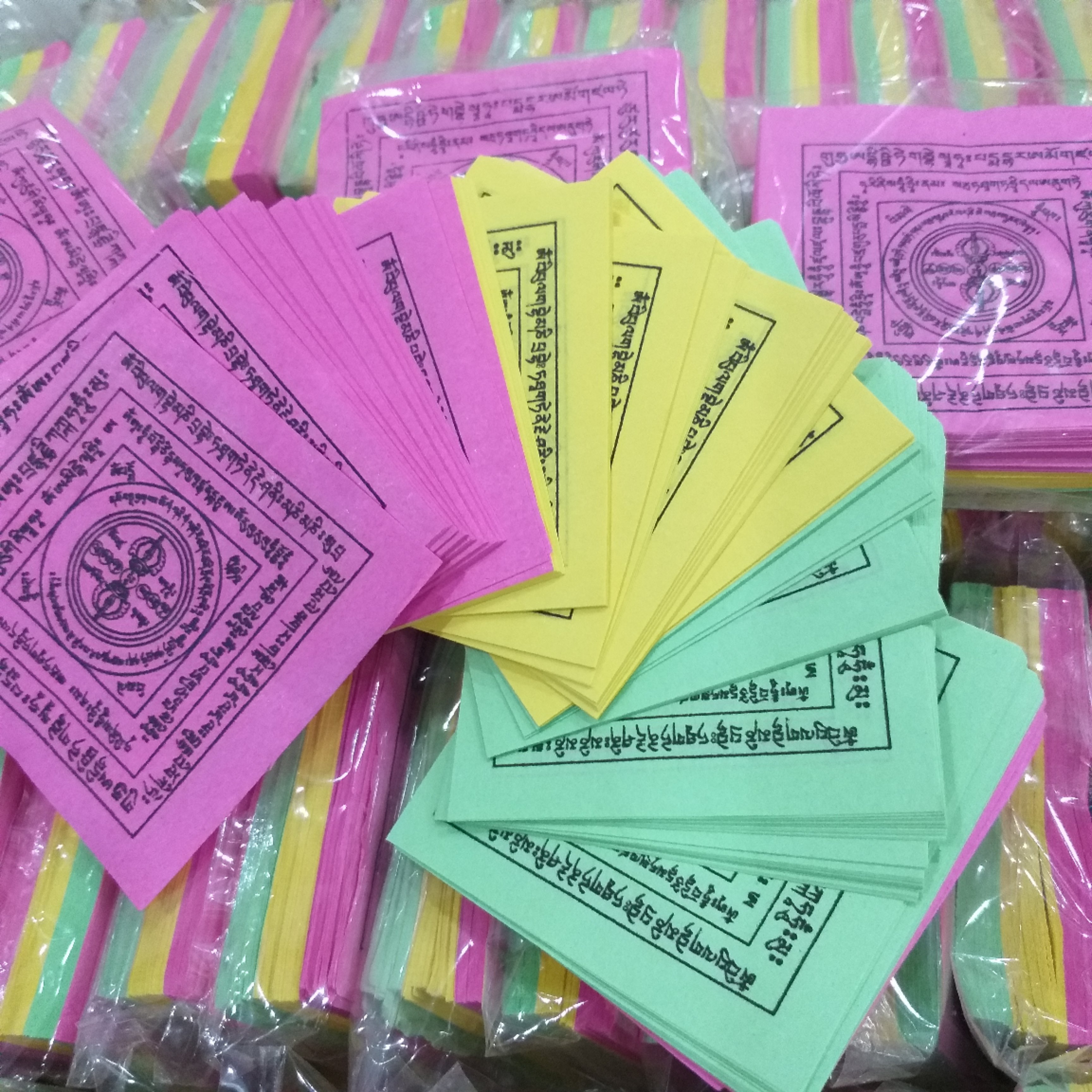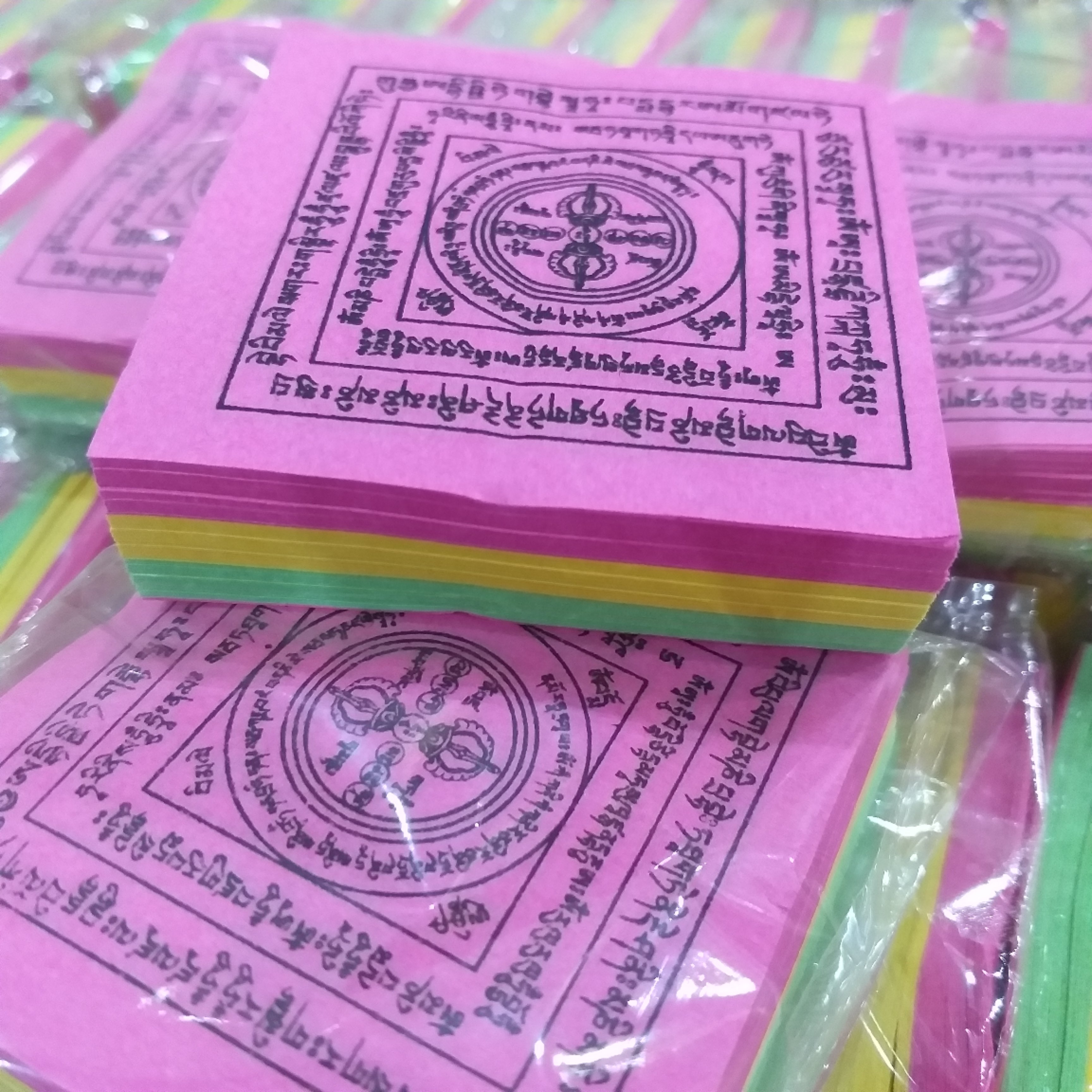 giấy lục đạo cúng dường sáu cõi luân hồi !  Lục Đạo Kim Cương Chú có thể dịch là Đới Thành Phật Chú. Chú này là Kim Cương Tổng Trì với Tổng Tâm Chú của năm Đức Phật ở năm phương, có Uy Thần cảm ứng, chuyên độ chúng sinh trong sáu đường (Trời, Người, A Tu La, súc sinh, Quỷ đói, Địa Ngục) thành Phật, Công Đức rất thù thắng chẳng thể nghĩ bàn Chú này một lần trải qua tai liền hay tiêu trừ Nghiệp đời trước. Phàm lỗ tai nghe tiếng của Chú này, hoặc con mắt nhìn thấy Chú này, hoặc thân tay tiếp chạm Chú này… đều tiêu diệt nghiệp chướng trong ba đời, tương lai đều được thành Phật Đối với việc siêu độ chúng sinh đã chết thì Công Đức rất lớn. Chúng sinh đã chết tuy bị đọa vào đường ác cũng có thể ra khỏi được. Chân thành tụng 10 vạn biến làm căn bản, ắt khi độ vong thời niệm tụng 7 biến cho đến 108 biến thì chúng sinh trong sáu đường được độ kia liền có thể tiêu trừ tội chướng, tức thời vãng sinh về Thế Giới Cực Lạc (Sukha-vatī), thấy Phật nghe Pháp. Dùng Chú này độ khắp cả chúng sinh có vô lượng vô biên Công Đức. 1_Đeo mang Chú này, một khi xả tuổi thọ, cũng có thể thành Phật 2_Phàm tai nghe, mắt nhìn thấy hoặc thân tay tiếp chạm Chú này, đều hay trừ diệt nghiệp chướng của số việc, ở đời này hoặc đương lai rốt ráo thành Phật 3_Lúc sống, niệm Chú này nhiều sẽ ngộ Vô Sinh Nhẫn, sau khi chết thiêu đốt có thể được Xá Lợi (Śarīra) 4_Chú này độ vong có Công Đức rất lớn. Nếu tụng đủ 10 vạn biến làm cơ sở, sau đó thất chúng sinh có tội khổ sắp chết, chân thành tụng 7 biến đến 108 biến. Khi Chân Ngôn đi vào lỗ tai tức hay miễn trừ mọi khổ về đao, búa, gậy, chỉa ba…. 5_Chân thành tụng Chú này gia trì vào cát, đất, lúa đậu, gạo… rồi rải lên tất cả thân phần hoặc mồ mả của người chết. Tức khiến cho người chết đã bị đọa trong ba đường ác cũng có thể tiêu trừ tội chướng, vãng sinh về Thế Giới Cực Lạc... Do Lục Đạo Kim Cương Chú có Công Đức tương đồng với Đại Mật Tông Căn Bản Chú: MAMA KOLIṄ SAMANTAḤ nên các bậc Đạo Sư Tây Tạng thường ghép hai Chú này kèm với Thần Chú của Kim Cương Tát Đỏa Bồ Tát hình thành Chú Luân để đeo mang trên thân.(hình đầu) _Hàng ngang bên trên là Thần Chú của Kim Cương Tát Đỏa (Vajra-satva) OṂ VAJRA-SATVA HŪṂ ĀḤ _Hàng ngang ở giữa là Lục Đạo Kim Cương Chú với chủng tử HŪṂ của Kim Cương Tát Đỏa: AḤ AḤ ŚAḤ (HŪṂ) SAḤ MAḤ HAḤ _Hàng ngang bên dưới là Đại Mật Tông Căn Bản Chú: MAMA KOLIRA (?KOLIṄ) SAMANTAḤ BỘI ĐỚI GIẢI THOÁT HỘ THÂN CHÚ LUÂN (Hình 2) _Hình vuông thứ nhất bên ngoài: OṂ_ VIPULA-GARBHE MAṆI-PRABHE TATHĀGATE NIRDAŚANI MAṆI MAṆI SUPRABHE VIMALE SAGARA GAMBHIRA HŪṂ HŪṂ JVALA JVALA BHUDDHA VILOKITE GUHYA ADHIṢTHITEGARBHE SVĀHĀ PADMA-DHARA AMOGA JAYE CURU CURU SVĀHĀ OṂ ĀḤ PRAJÑĀ ḌHIK KKA HĀ HŪṂ MUḤ Hình vuông thứ hai: OṂ ĀḤ HŪṂ BODHI-CITTA MAHĀ-SUBĪ JÑĀNADHĀRDU AḤ OṂ RULU RULU HŪṂ BHYO HŪṂ OṂ MAṆI PADME HŪṂ_ OṂ ĀḤ HŪṂ GURU PADMA SIDDHI HŪṂ HARIṆISA NAMAḤ SARVA TATHĀGATA-HRIDAYA ANUGATE_OṂ KURUṂGINI SVĀHĀ OṂ AMIDHEVĀ HRĪḤ A _Hình vuông thứ ba bên trong: .)Góc trên bên trái: OṂ PADMO .)Góc trên bên phải: UṢṆĪṢA .)Góc dưới bên phải: VIMALE .)Góc dưới bên trái: HŪṂ PHAṬ _Vòng tròn bên ngoài: NAMO RATNA-TRAYĀYA _ OṂ KAṂKAṆI KAṂKAṆI ROCAṆI ROCAṆI TROTANI TROTANI TRĀSANI TRĀSANI PRATIHANA PRATIHANA_SARVA KARMA PARAṂ PARAṆIME SARVA SATĀNAJAYE SVĀHĀ _Vòng tròn trung ương: OṂ VAJRA-SATVA ĀḤ AḤ AḤ ŚAḤ (HŪṂ) SAḤ MAḤ HAḤ MAMA KOLIṄ SAMANTAḤ _LƯU Ý : Khi đốt các bạn dùng viên trầm để lên trên linh phù . Cảm ơn bạn đã ghé shop, mong rằng shop chúng tôi có thể giúp được bạn!