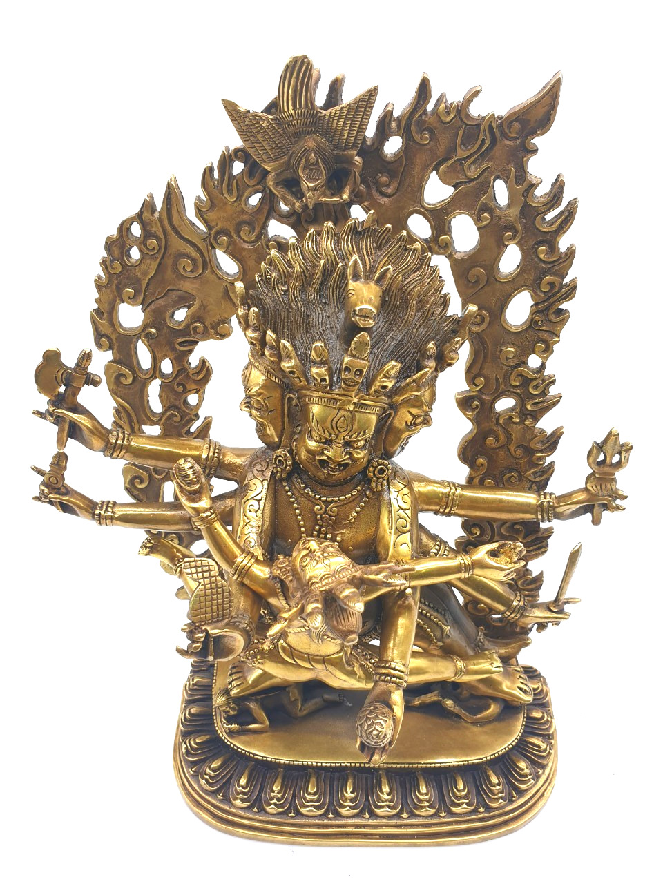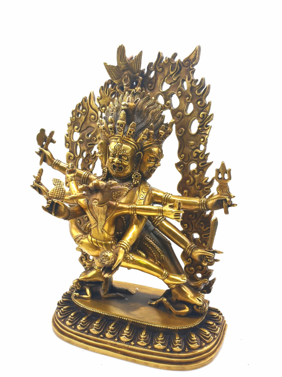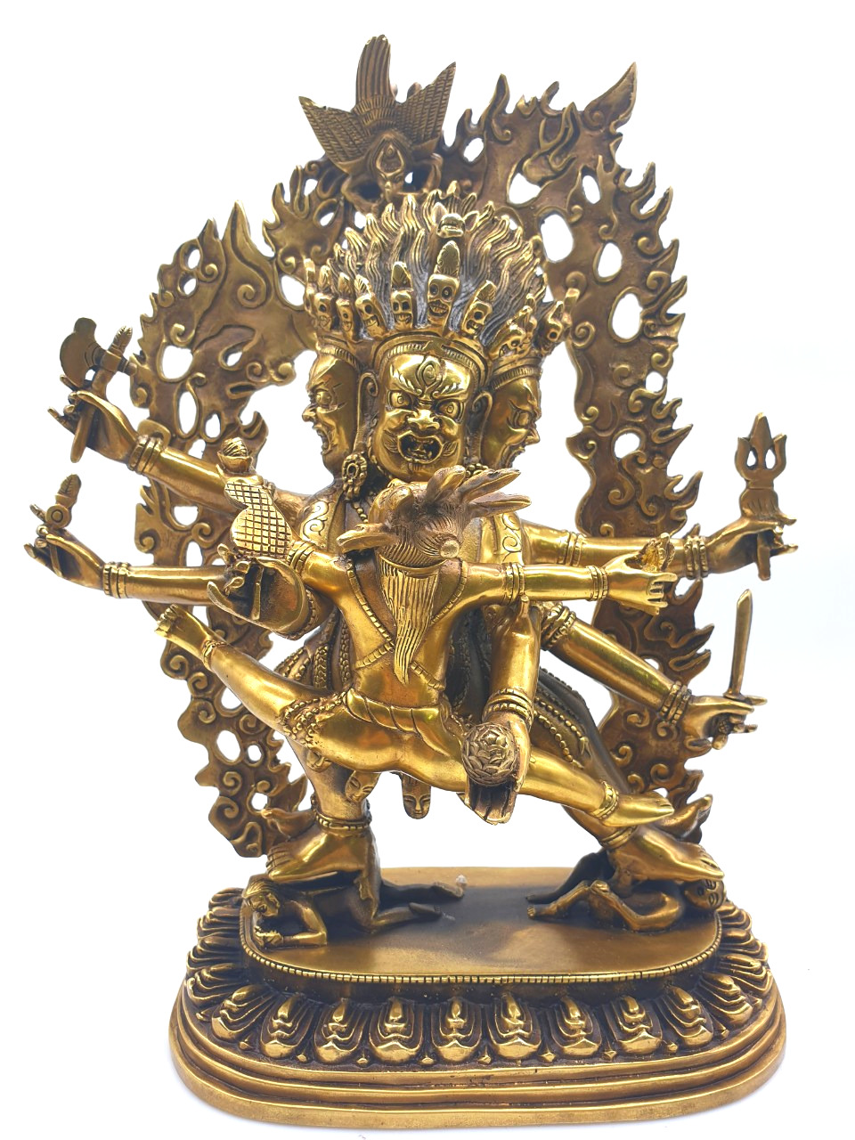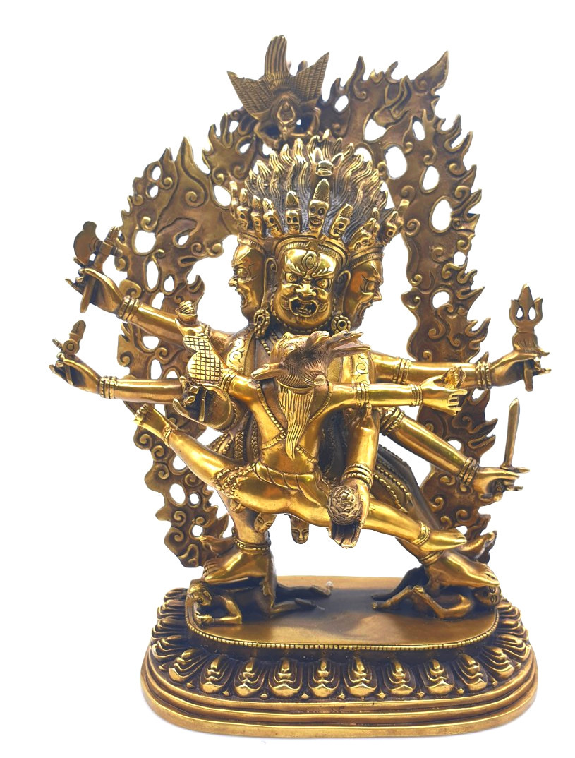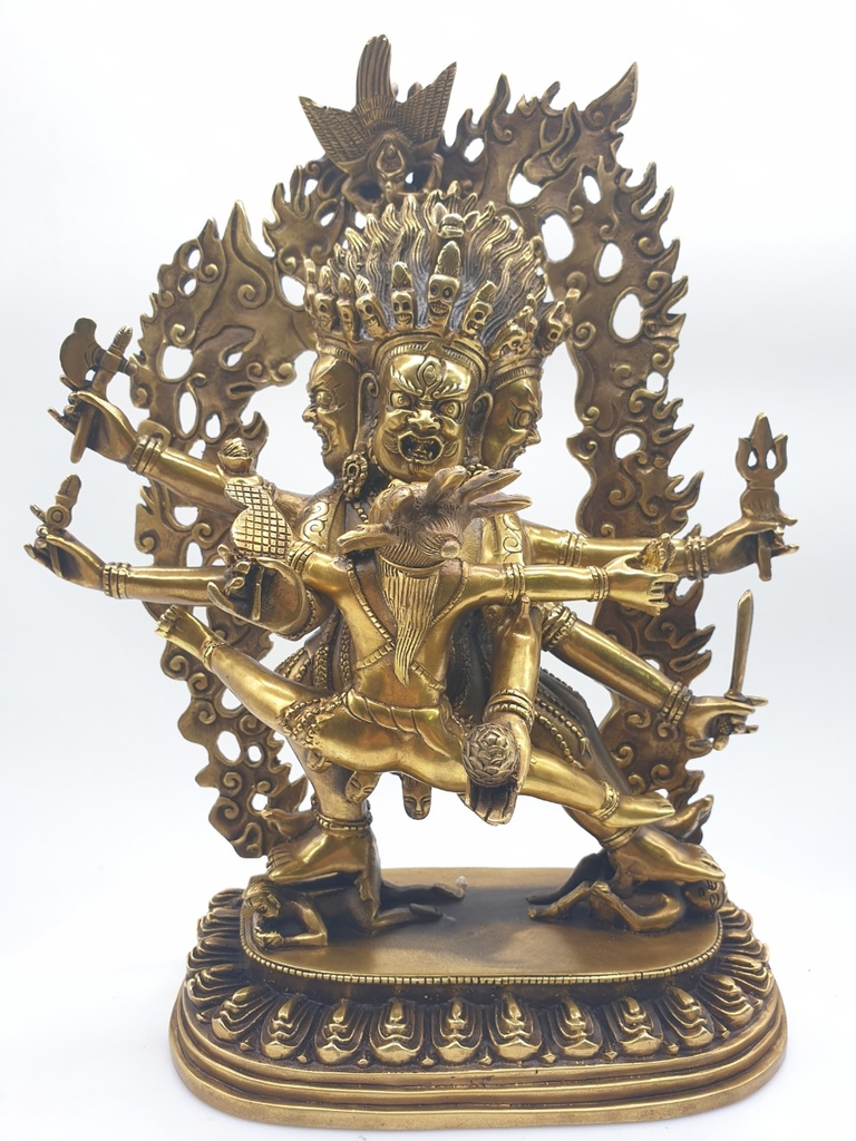 Tất cả mọi thứ về sinh vật này đó là khuôn mặt đáng sợ với ba con mắt, cái miệng đang gầm rống đầy những răng nanh, tư thế đứng của một chiến binh, chiếc bụng to lớn ẩn chứa một nội lực phi phàm trong đó. Tay phải vung thanh kiếm để đe doạ đối phương, tay trái giơ lên phụ trợ trong một tư thế đáng sợ, đồ trang sức của ngài đó là những con rắn. Nét đẹp của nó lại là những điều đáng sợ vì chính cái khía cạnh đáng sợ đó lại là biểu lộ của sự từ bi, chính cái đáng sợ đó giúp buông bỏ được bản ngã, và xuyên thủng được màn vô minh.