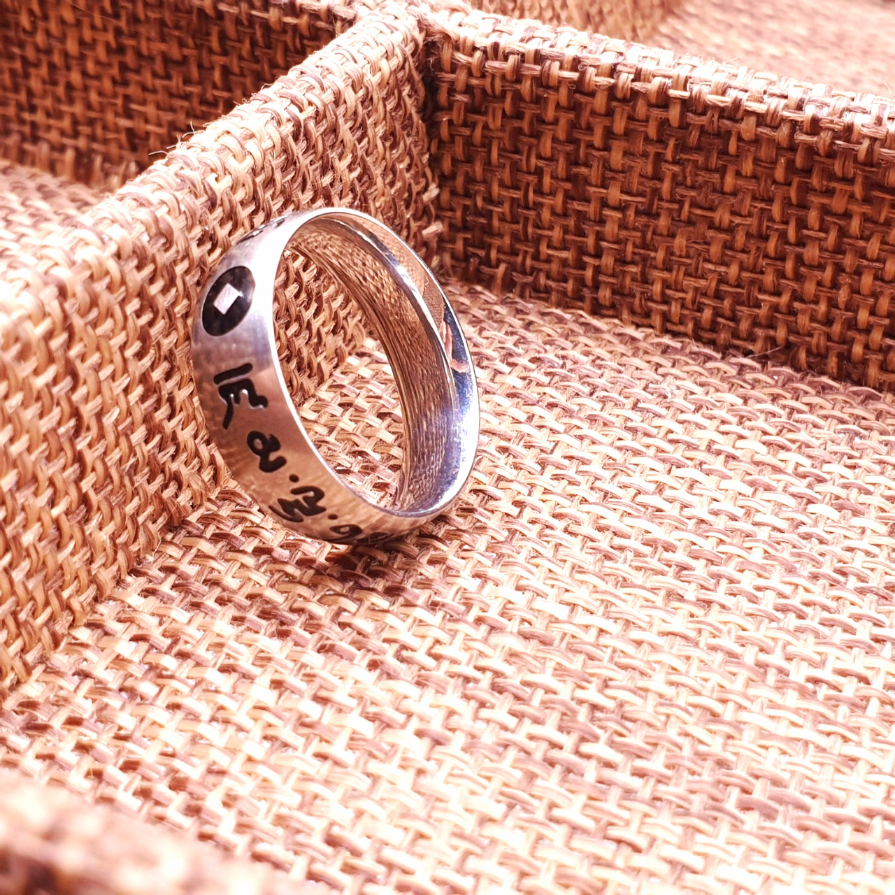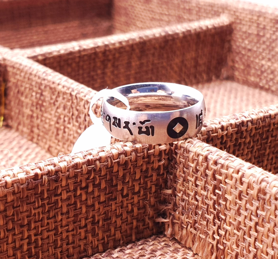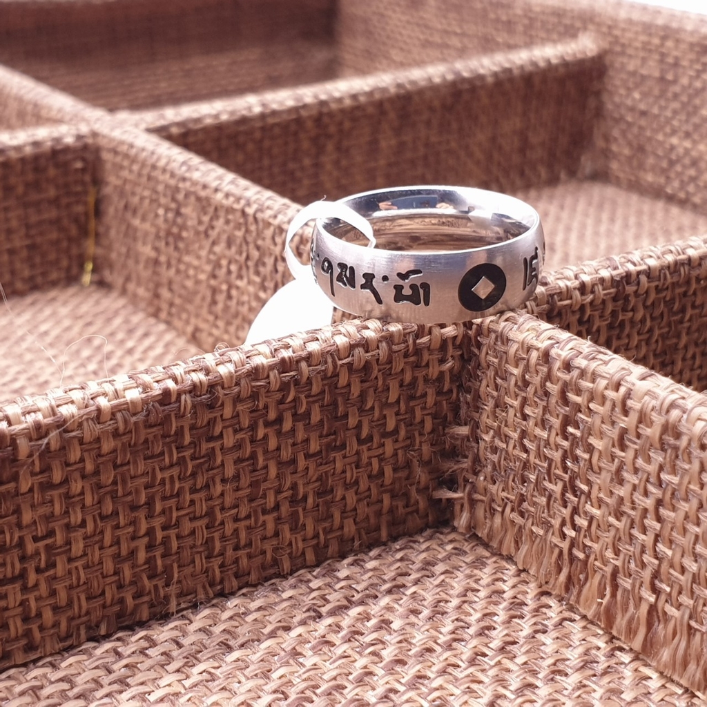 Nhẫn Khắc Om Mani Màu Trắng Chữ Đen,Chấm Tròn Đen_24x6mm_Chất liệu Titan