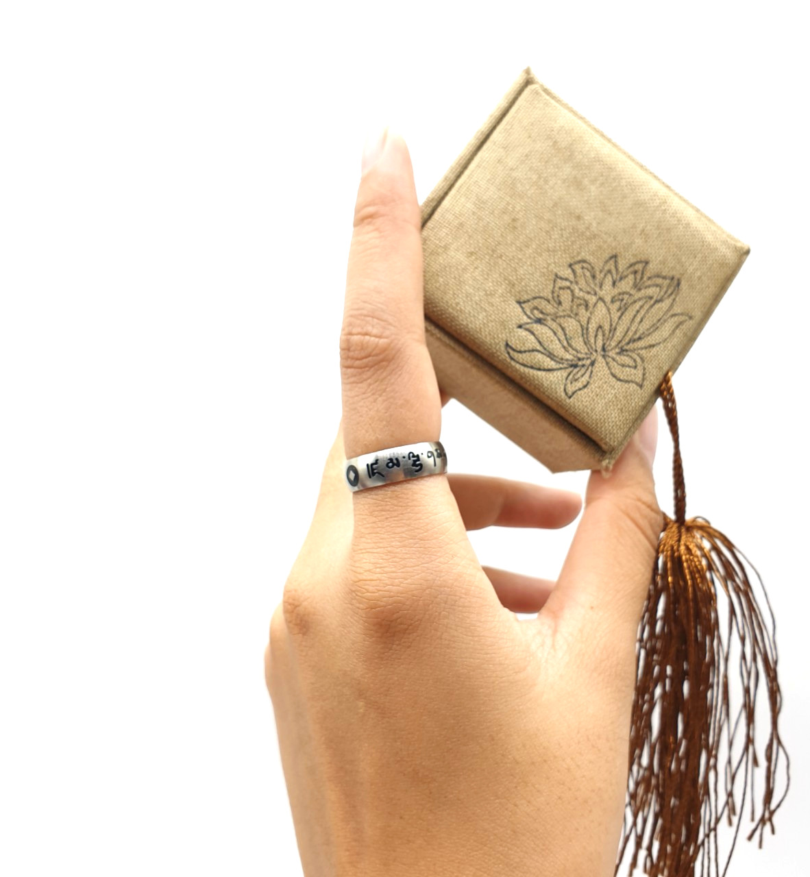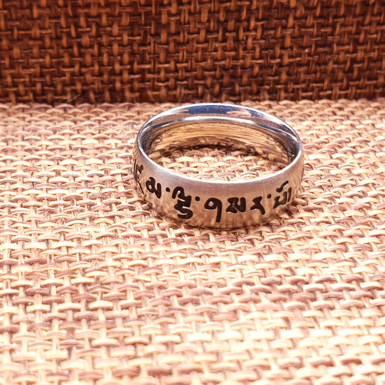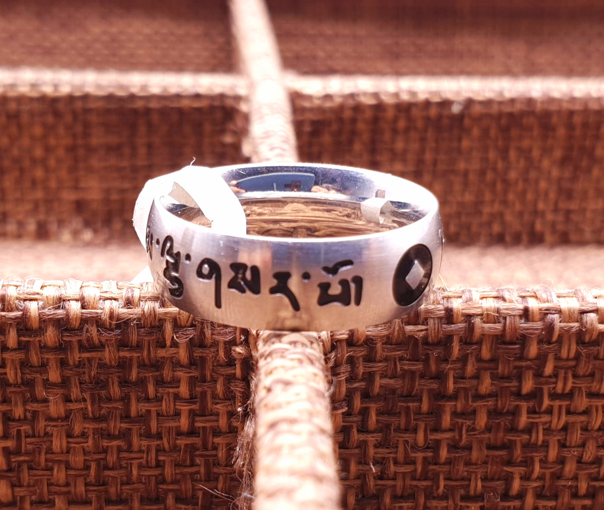 Nhẫn Khắc Om Mani Màu Trắng Chữ Đen,Chấm Tròn Đen_24x6mm_Chất liệu Titan