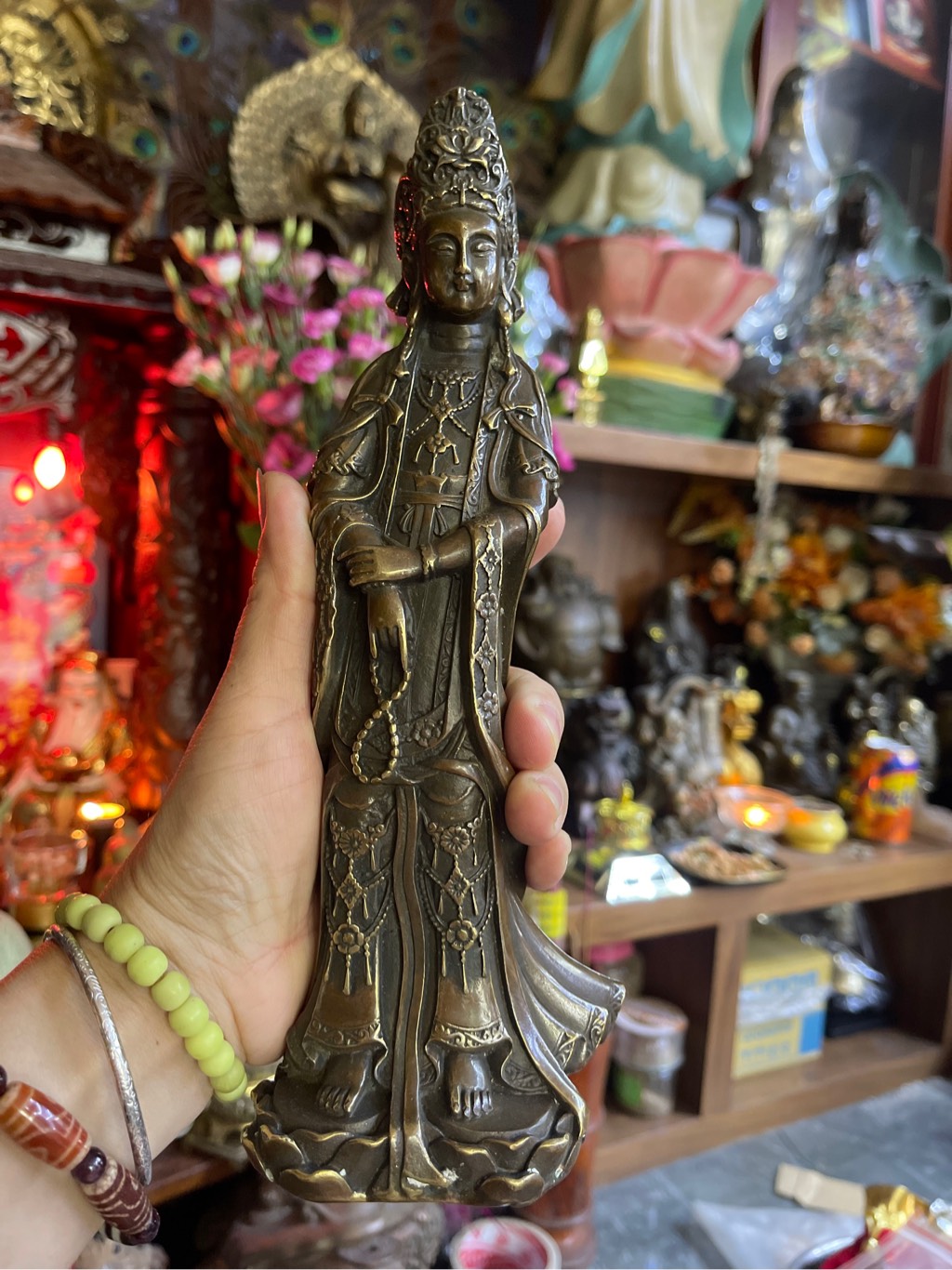 Tượng Ngài hình người nữ đứng trên hoa sen, tay mặt cầm cành dương, tay trái cầm bình thanh tịnh, trong bình đựng nước cam lồ. Chúng ta hằng lạy mười hai câu nguyện sau khi tụng phẩm Phổ Môn, có câu: “Nam mô thanh tịnh bình thùy dương liễu, Quán Âm Như Lai cam lồ sái tâm nguyện”.
