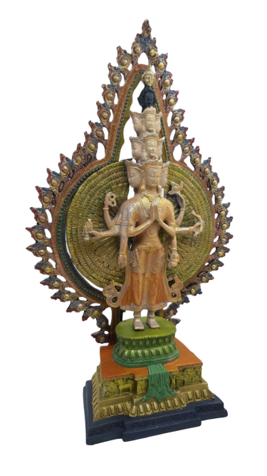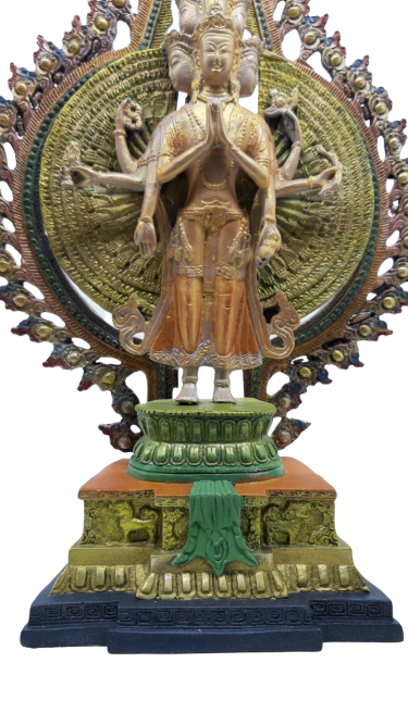 Bên trái:Taythứ hai cầm hoa sen vàng, tay thứ ba cầm bình có chứa nước Cam Lộ, tay thứ tư cầm cung tên.