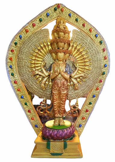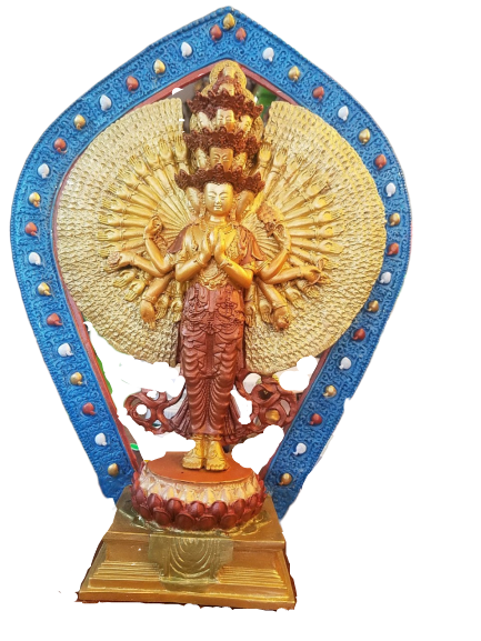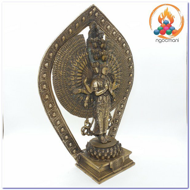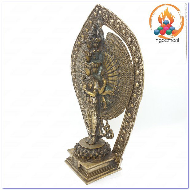 Bên trái:Taythứ hai cầm hoa sen vàng, tay thứ ba cầm bình có chứa nước Cam Lộ, tay thứ tư cầm cung tên.