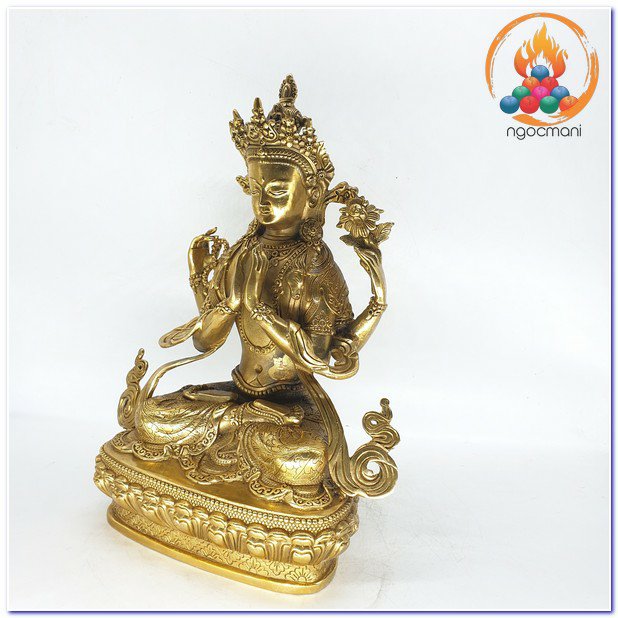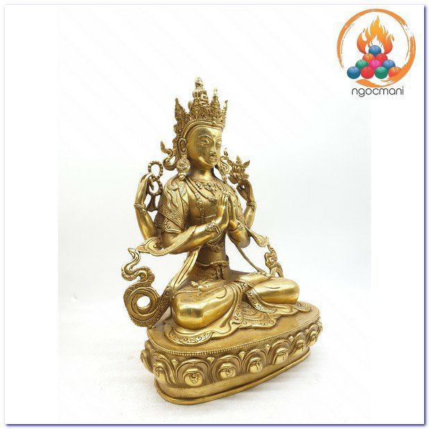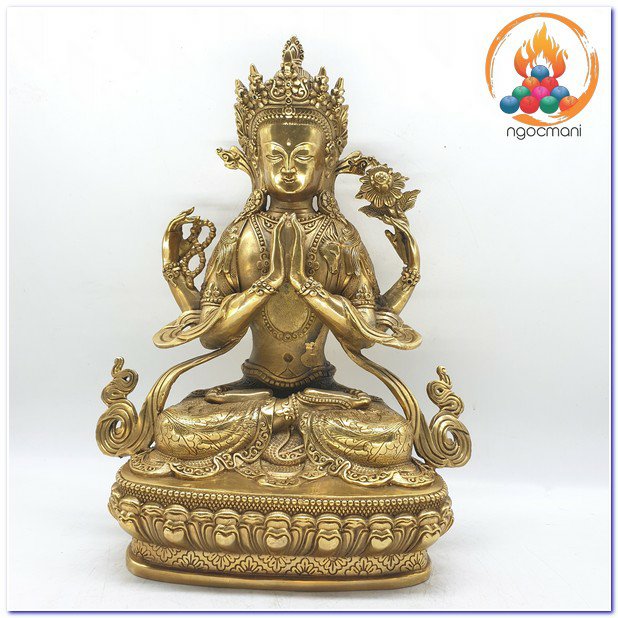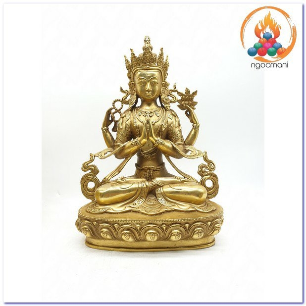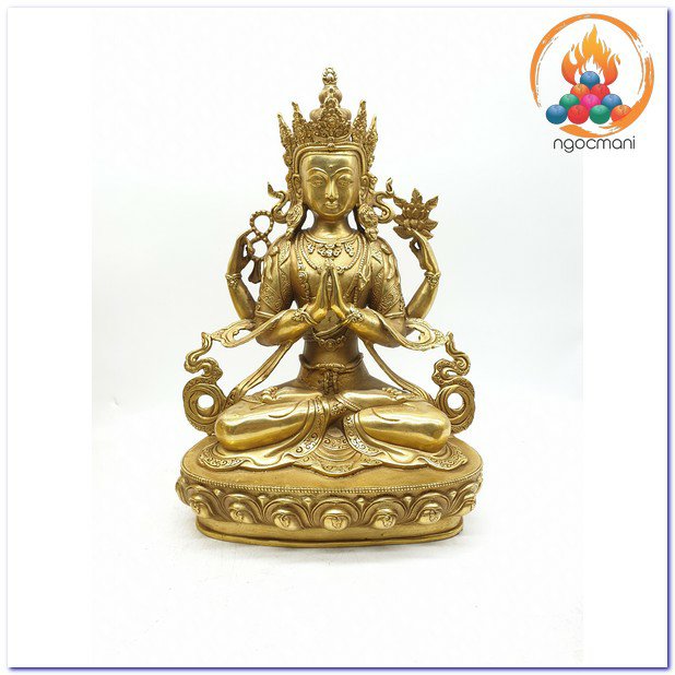 Đức Quan Âm là hiện thân vô ngại của sự thanh tịnh thuần khiết, của lòng từ bi, tình yêu thương và trí tuệ với bản nguyện khai mở, hiển lộ Bồ đề tâm và công đức đại bi sẵn có nơi tâm tất cả hữu tình. Ngài được mô tả trong sắc thân trong suốt rạng ngời, an tọa trên tòa sen trắng và đĩa mặt trăng, mỉm cười trong tình yêu thương bình đẳng, hướng cặp mắt từ bi diệu vợi với năng lực chữa lành hướng về chúng sinh. Ngài an tọa trong tư thế Kim Cương thể hiện tính nhất như của sinh tử và Niết bàn, trang sức các thiên y lụa là trang hoàng quý báu nêu biểu cho tất cả phẩm hạnh giác ngộ, áo da thú trên vai thể hiện hạnh nguyện nhập thế. Đức Quan Âm Tứ Thủ có một mặt bốn tay nêu biểu sự chứng ngộ Tứ vô lượng Tâm, hai tay phía trước trì giữ ngọc Như ý Mani, tay phải thứ hai cầm tràng pha lê, tay trái thứ hai trì giữ hoa sen. Hai tay phía trước kết ấn Liên hoa trì giữ ngọc Như ý thể hiện năng lực của lòng từ bi và trí tuệ hiểu biết có thể viên mãn mọi tâm nguyện của chúng sinh, giúp mọi ước nguyện thế gian và xuất thế gian đều được vẹn toàn như ý. Tay phải thứ hai cầm tràng pha lê nêu biểu sự liên tục cứu giúp chúng sinh mà không bỏ xót một ai, và chuỗi tràng cũng nêu biểu chân ngôn của Ngài. Trong khi tay trái thứ hai cầm hoa sen nêu biểu Bồ đề tâm thanh tịnh dù ứng hiện thân vào các cõi luân hồi nhiễm ô để cứu giúp chúng sinh, nhưng Ngài vẫn thanh tịnh vô nhiễm như hoa sen mọc trong bùn. Tất cả đặc điểm trong hình ảnh đức Quan Âm là nêu biểu những hạnh đức, thần lực và công hạnh Ba la mật vi diệu của Ngài.