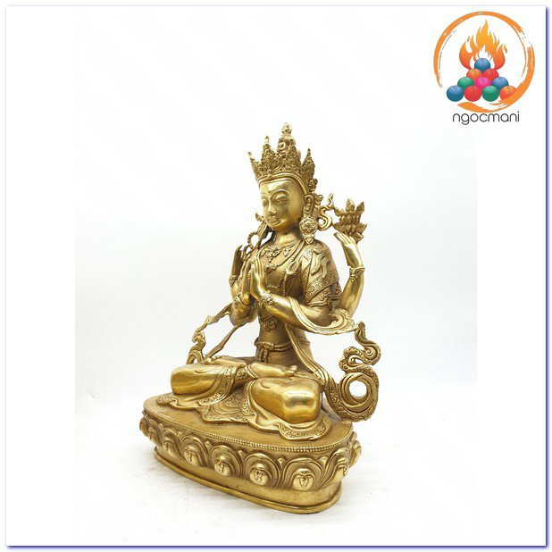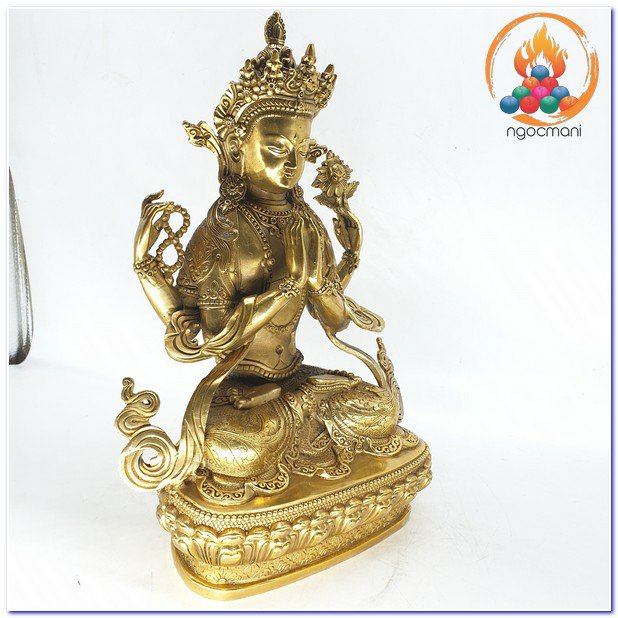 Đức Quan Âm là hiện thân vô ngại của sự thanh tịnh thuần khiết, của lòng từ bi, tình yêu thương và trí tuệ với bản nguyện khai mở, hiển lộ Bồ đề tâm và công đức đại bi sẵn có nơi tâm tất cả hữu tình. Ngài được mô tả trong sắc thân trong suốt rạng ngời, an tọa trên tòa sen trắng và đĩa mặt trăng, mỉm cười trong tình yêu thương bình đẳng, hướng cặp mắt từ bi diệu vợi với năng lực chữa lành hướng về chúng sinh. Ngài an tọa trong tư thế Kim Cương thể hiện tính nhất như của sinh tử và Niết bàn, trang sức các thiên y lụa là trang hoàng quý báu nêu biểu cho tất cả phẩm hạnh giác ngộ, áo da thú trên vai thể hiện hạnh nguyện nhập thế. Đức Quan Âm Tứ Thủ có một mặt bốn tay nêu biểu sự chứng ngộ Tứ vô lượng Tâm, hai tay phía trước trì giữ ngọc Như ý Mani, tay phải thứ hai cầm tràng pha lê, tay trái thứ hai trì giữ hoa sen. Hai tay phía trước kết ấn Liên hoa trì giữ ngọc Như ý thể hiện năng lực của lòng từ bi và trí tuệ hiểu biết có thể viên mãn mọi tâm nguyện của chúng sinh, giúp mọi ước nguyện thế gian và xuất thế gian đều được vẹn toàn như ý. Tay phải thứ hai cầm tràng pha lê nêu biểu sự liên tục cứu giúp chúng sinh mà không bỏ xót một ai, và chuỗi tràng cũng nêu biểu chân ngôn của Ngài. Trong khi tay trái thứ hai cầm hoa sen nêu biểu Bồ đề tâm thanh tịnh dù ứng hiện thân vào các cõi luân hồi nhiễm ô để cứu giúp chúng sinh, nhưng Ngài vẫn thanh tịnh vô nhiễm như hoa sen mọc trong bùn. Tất cả đặc điểm trong hình ảnh đức Quan Âm là nêu biểu những hạnh đức, thần lực và công hạnh Ba la mật vi diệu của Ngài.