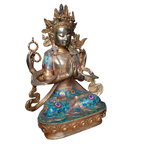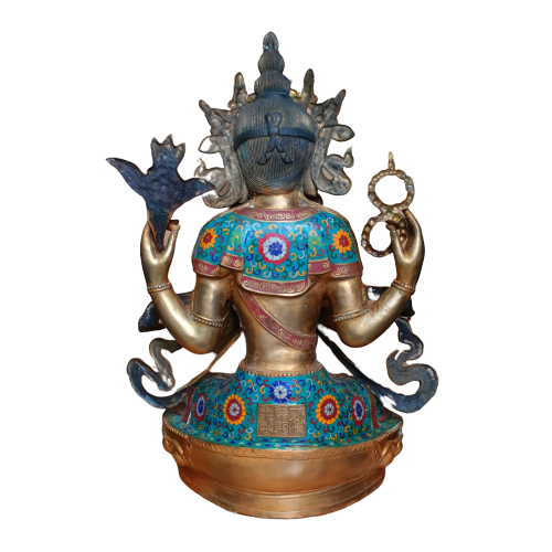 Đức Quan Âm là hiện thân vô ngại của sự thanh tịnh thuần khiết, của lòng từ bi, tình yêu thương và trí tuệ với bản nguyện khai mở, hiển lộ Bồ đề tâm và công đức đại bi sẵn có nơi tâm tất cả hữu tình. Ngài được mô tả trong sắc thân trong suốt rạng ngời, an tọa trên tòa sen trắng và đĩa mặt trăng, mỉm cười trong tình yêu thương bình đẳng, hướng cặp mắt từ bi diệu vợi với năng lực chữa lành hướng về chúng sinh. Ngài an tọa trong tư thế Kim Cương thể hiện tính nhất như của sinh tử và Niết bàn, trang sức các thiên y lụa là trang hoàng quý báu nêu biểu cho tất cả phẩm hạnh giác ngộ, áo da thú trên vai thể hiện hạnh nguyện nhập thế. Đức Quan Âm Tứ Thủ có một mặt bốn tay nêu biểu sự chứng ngộ Tứ vô lượng Tâm, hai tay phía trước trì giữ ngọc Như ý Mani, tay phải thứ hai cầm tràng pha lê, tay trái thứ hai trì giữ hoa sen. Hai tay phía trước kết ấn Liên hoa trì giữ ngọc Như ý thể hiện năng lực của lòng từ bi và trí tuệ hiểu biết có thể viên mãn mọi tâm nguyện của chúng sinh, giúp mọi ước nguyện thế gian và xuất thế gian đều được vẹn toàn như ý. Tay phải thứ hai cầm tràng pha lê nêu biểu sự liên tục cứu giúp chúng sinh mà không bỏ xót một ai, và chuỗi tràng cũng nêu biểu chân ngôn của Ngài. Trong khi tay trái thứ hai cầm hoa sen nêu biểu Bồ đề tâm thanh tịnh dù ứng hiện thân vào các cõi luân hồi nhiễm ô để cứu giúp chúng sinh, nhưng Ngài vẫn thanh tịnh vô nhiễm như hoa sen mọc trong bùn. Tất cả đặc điểm trong hình ảnh đức Quan Âm là nêu biểu những hạnh đức, thần lực và công hạnh Ba la mật vi diệu của Ngài.