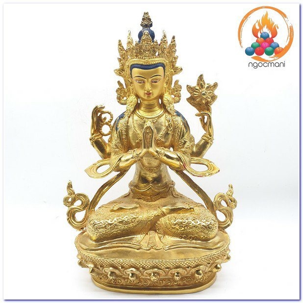 Đức Quan Âm là hiện thân vô ngại của sự thanh tịnh thuần khiết, của lòng từ bi, tình yêu thương và trí tuệ với bản nguyện khai mở, hiển lộ Bồ đề tâm và công đức đại bi sẵn có nơi tâm tất cả hữu tình. Ngài được mô tả trong sắc thân trong suốt rạng ngời, an tọa trên tòa sen trắng và đĩa mặt trăng, mỉm cười trong tình yêu thương bình đẳng, hướng cặp mắt từ bi diệu vợi với năng lực chữa lành hướng về chúng sinh. Ngài an tọa trong tư thế Kim Cương thể hiện tính nhất như của sinh tử và Niết bàn, trang sức các thiên y lụa là trang hoàng quý báu nêu biểu cho tất cả phẩm hạnh giác ngộ, áo da thú trên vai thể hiện hạnh nguyện nhập thế. Đức Quan Âm Tứ Thủ có một mặt bốn tay nêu biểu sự chứng ngộ Tứ vô lượng Tâm, hai tay phía trước trì giữ ngọc Như ý Mani, tay phải thứ hai cầm tràng pha lê, tay trái thứ hai trì giữ hoa sen. Hai tay phía trước kết ấn Liên hoa trì giữ ngọc Như ý thể hiện năng lực của lòng từ bi và trí tuệ hiểu biết có thể viên mãn mọi tâm nguyện của chúng sinh, giúp mọi ước nguyện thế gian và xuất thế gian đều được vẹn toàn như ý. Tay phải thứ hai cầm tràng pha lê nêu biểu sự liên tục cứu giúp chúng sinh mà không bỏ xót một ai, và chuỗi tràng cũng nêu biểu chân ngôn của Ngài. Trong khi tay trái thứ hai cầm hoa sen nêu biểu Bồ đề tâm thanh tịnh dù ứng hiện thân vào các cõi luân hồi nhiễm ô để cứu giúp chúng sinh, nhưng Ngài vẫn thanh tịnh vô nhiễm như hoa sen mọc trong bùn. Tất cả đặc điểm trong hình ảnh đức Quan Âm là nêu biểu những hạnh đức, thần lực và công hạnh Ba la mật vi diệu của Ngài.