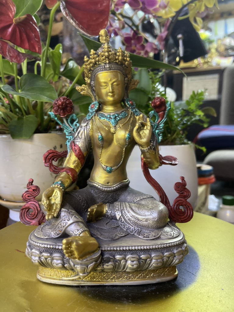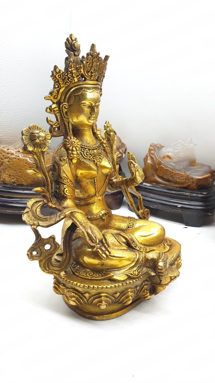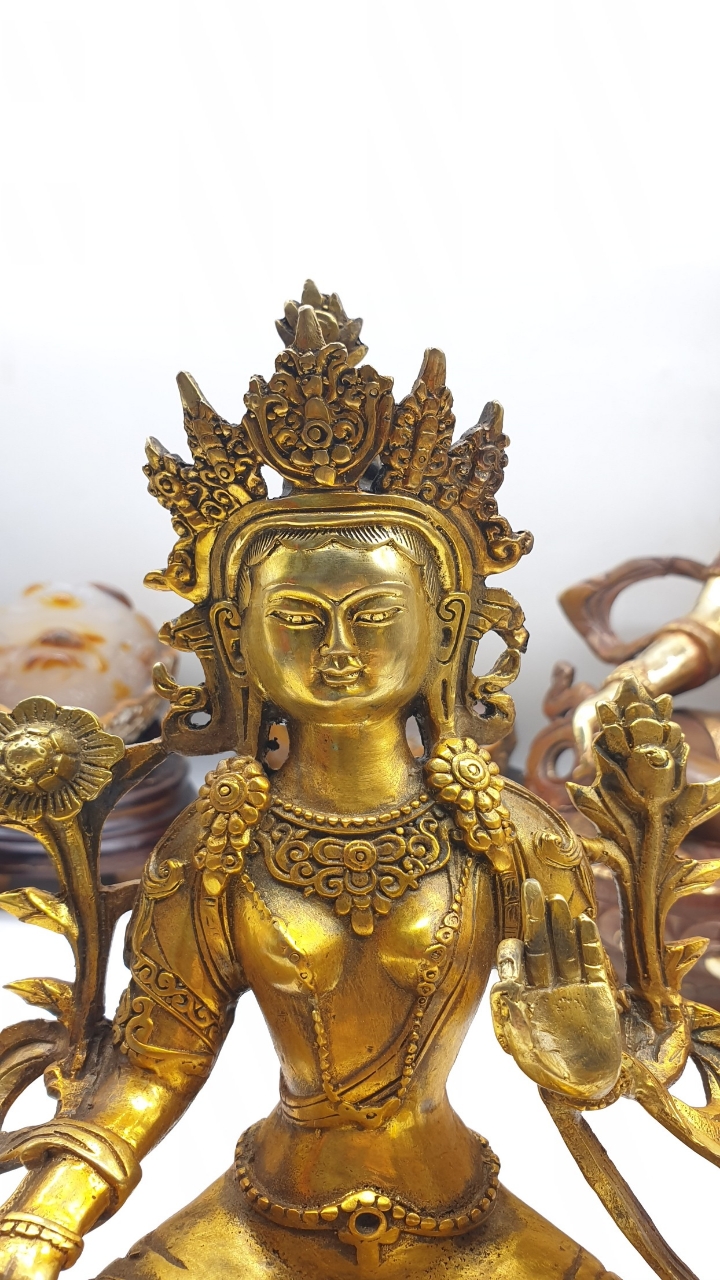 Trong mỗi bàn tay của Ngài trì giữ hoa Utpala, hoa sen xanh. Bên phía tay trái, một bông nụ là nêu biểu chư Phật tương lai, bông nở hoàn toàn là nêu biểu chư Phật quá khứ, bông đang nở là nêu biểu đức Phật hiện tại. Trên vương miện của Đức Tara là Bản Sư Di Đà an bình và mỉm cười. Vì đức Phật Di Đà là bậc thượng sư hướng đạo tâm linh của Đức Tara, được an trí trên vương miện của đức Tara nhằm nêu biểu tầm quan trọng khi có bậc Căn bản Thượng sư đầy đủ phẩm hạnh trí tuệ và lòng từ bi dẫn dắt đệ tử đi đúng trên con đường giác ngộ, và cũng nêu biểu Đức Tara luôn trú tâm vào giáo pháp mà Ngài được đón nhận từ bậc Thượng Sư của mình. Điều này nhắc nhở chúng ta thực hành noi theo thiện hạnh của Ngài.