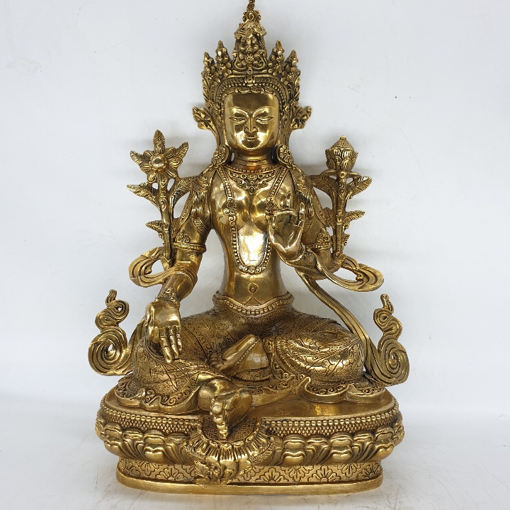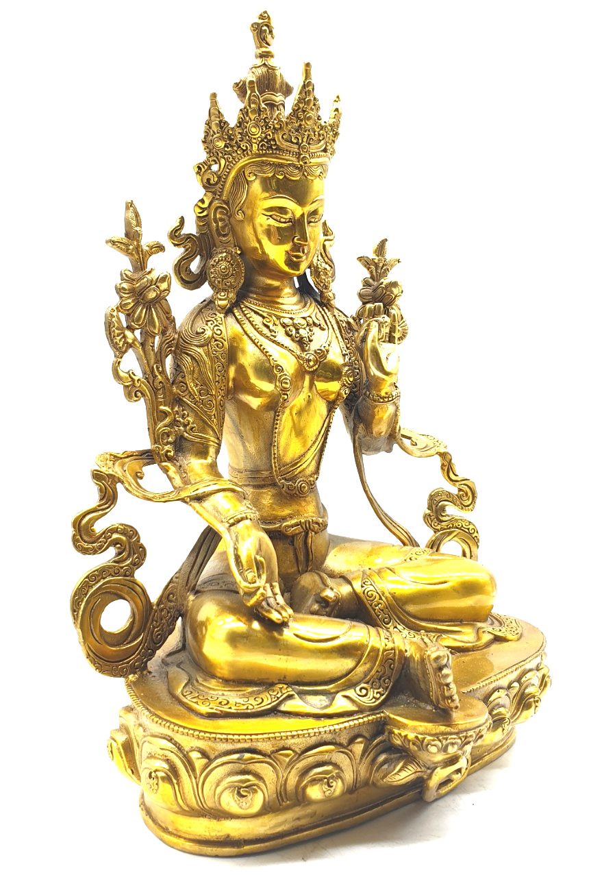 Trong mỗi bàn tay của Ngài trì giữ hoa Utpala, hoa sen xanh. Bên phía tay trái, một bông nụ là nêu biểu chư Phật tương lai, bông nở hoàn toàn là nêu biểu chư Phật quá khứ, bông đang nở là nêu biểu đức Phật hiện tại. Trên vương miện của Đức Tara là Bản Sư Di Đà an bình và mỉm cười. Vì đức Phật Di Đà là bậc thượng sư hướng đạo tâm linh của Đức Tara, được an trí trên vương miện của đức Tara nhằm nêu biểu tầm quan trọng khi có bậc Căn bản Thượng sư đầy đủ phẩm hạnh trí tuệ và lòng từ bi dẫn dắt đệ tử đi đúng trên con đường giác ngộ, và cũng nêu biểu Đức Tara luôn trú tâm vào giáo pháp mà Ngài được đón nhận từ bậc Thượng Sư của mình. Điều này nhắc nhở chúng ta thực hành noi theo thiện hạnh của Ngài.