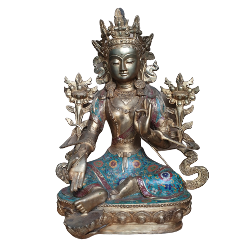 Trong mỗi bàn tay của Ngài trì giữ hoa Utpala, hoa sen xanh. Bên phía tay trái, một bông nụ là nêu biểu chư Phật tương lai, bông nở hoàn toàn là nêu biểu chư Phật quá khứ, bông đang nở là nêu biểu đức Phật hiện tại. Trên vương miện của Đức Tara là Bản Sư Di Đà an bình và mỉm cười. Vì đức Phật Di Đà là bậc thượng sư hướng đạo tâm linh của Đức Tara, được an trí trên vương miện của đức Tara nhằm nêu biểu tầm quan trọng khi có bậc Căn bản Thượng sư đầy đủ phẩm hạnh trí tuệ và lòng từ bi dẫn dắt đệ tử đi đúng trên con đường giác ngộ, và cũng nêu biểu Đức Tara luôn trú tâm vào giáo pháp mà Ngài được đón nhận từ bậc Thượng Sư của mình. Điều này nhắc nhở chúng ta thực hành noi theo thiện hạnh của Ngài.