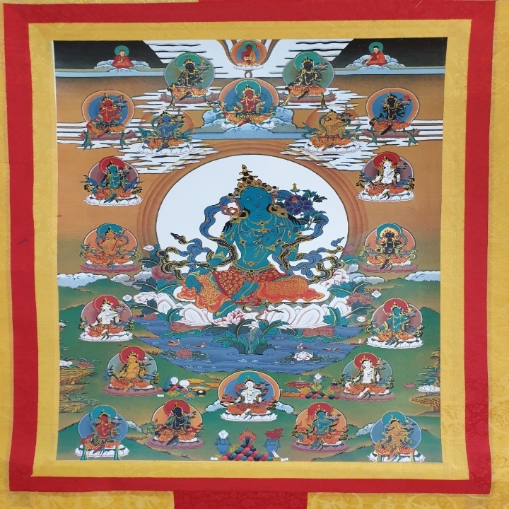 Tay trái của Ngài là Ấn Tam Bảo, với ngón tay cái chạm vào ngón tay đeo nhẫn và 3 ngón tay kia hướng thẳng, 3 ngón duỗi thẳng nêu biểu Tam bảo Phật, Pháp, Tăng có nghĩa rằng giao phó bản thân chúng ta nương tựa Ba ngôi báu và thực hành giáo pháp giải thoát. Ngón cái và ngón áp út chạm nhau nêu biểu chúng ta có thể hợp nhất lòng từ bi hỷ lạc và trí tuệ tính không.