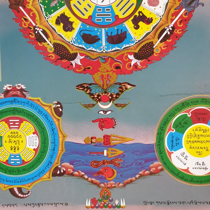 Phía bên trái là Thời Luân Kim Cương Chú Luân khiến cho phương trên, phương dưới, Đông, Nam, Tây, Bắc, bốn góc cùng với nhóm năm, tháng, ngày, giờ là Thời Không Vũ Trụ, tổ hợp Thế Giới tất cả tự tại