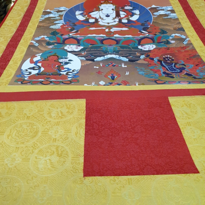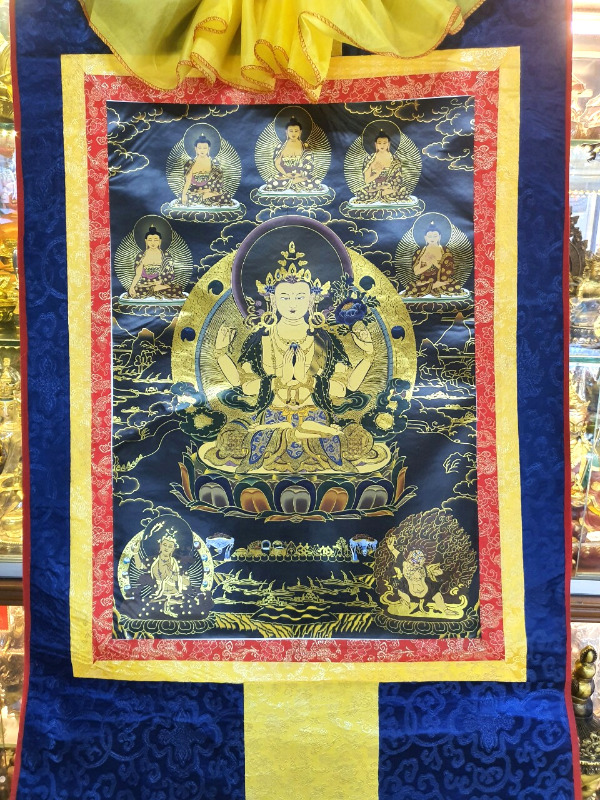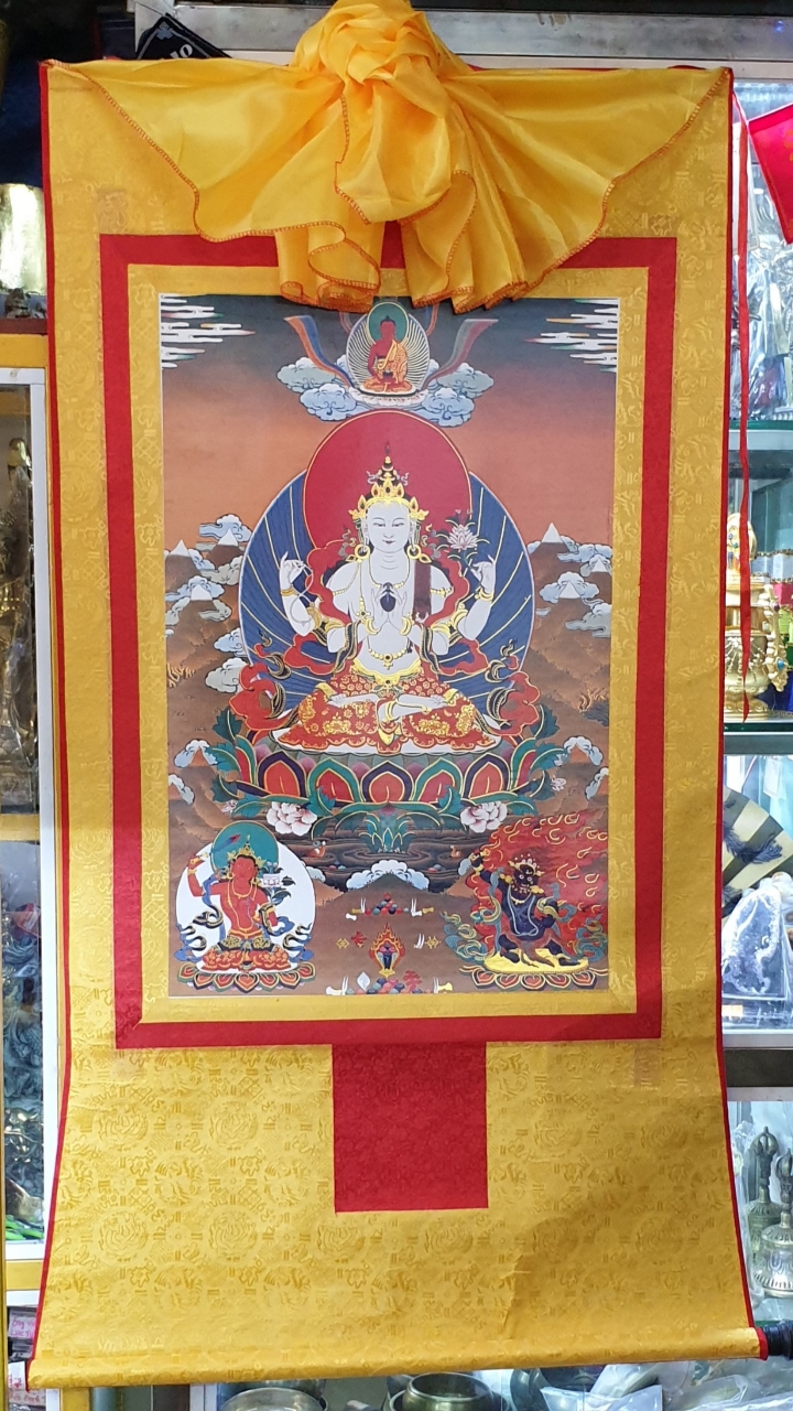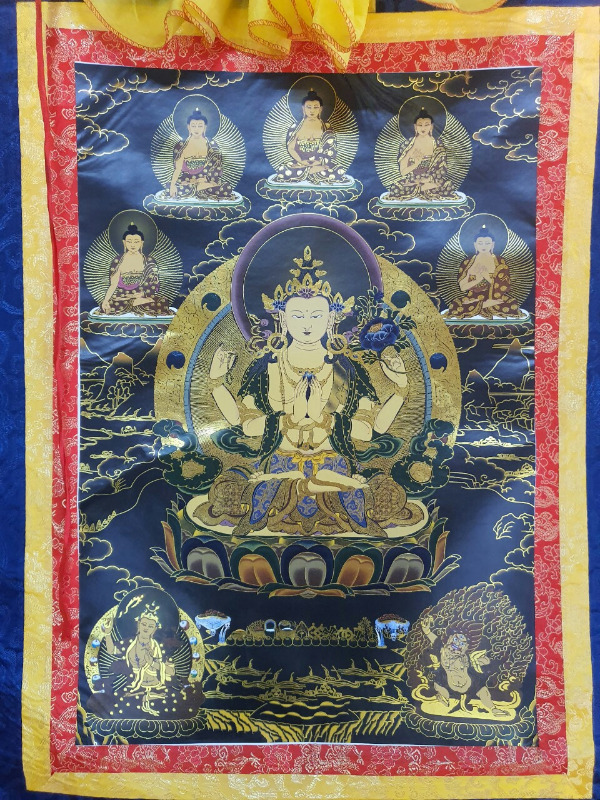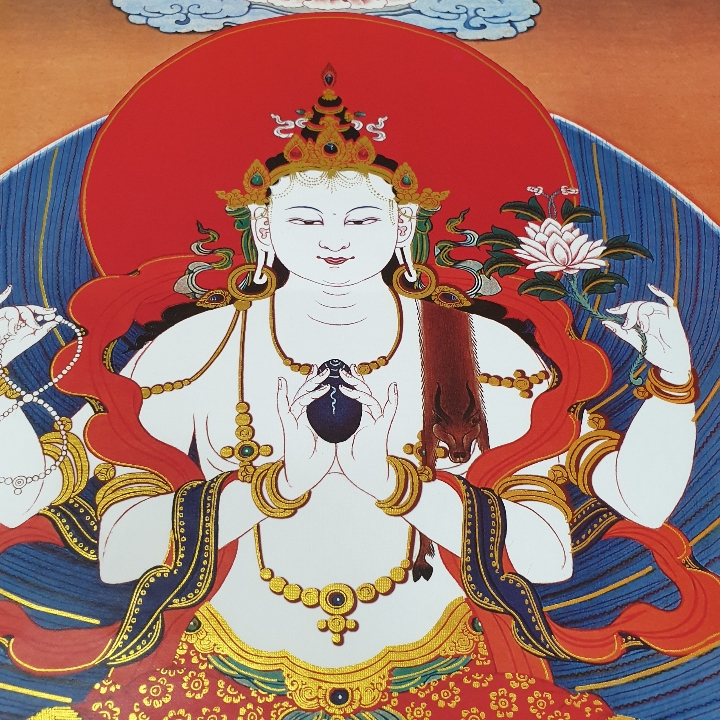 Đức Quan Âm là hiện thân vô ngại của sự thanh tịnh thuần khiết, của lòng từ bi, tình yêu thương và trí tuệ với bản nguyện khai mở, hiển lộ Bồ đề tâm và công đức đại bi sẵn có nơi tâm tất cả hữu tình. Ngài được mô tả trong sắc thân trong suốt rạng ngời, an tọa trên tòa sen trắng và đĩa mặt trăng, mỉm cười trong tình yêu thương bình đẳng, hướng cặp mắt từ bi diệu vợi với năng lực chữa lành hướng về chúng sinh. Ngài an tọa trong tư thế Kim Cương thể hiện tính nhất như của sinh tử và Niết bàn, trang sức các thiên y lụa là trang hoàng quý báu nêu biểu cho tất cả phẩm hạnh giác ngộ, áo da thú trên vai thể hiện hạnh nguyện nhập thế. Đức Quan Âm Tứ Thủ có một mặt bốn tay nêu biểu sự chứng ngộ Tứ vô lượng Tâm, hai tay phía trước trì giữ ngọc Như ý Mani, tay phải thứ hai cầm tràng pha lê, tay trái thứ hai trì giữ hoa sen. Hai tay phía trước kết ấn Liên hoa trì giữ ngọc Như ý thể hiện năng lực của lòng từ bi và trí tuệ hiểu biết có thể viên mãn mọi tâm nguyện của chúng sinh, giúp mọi ước nguyện thế gian và xuất thế gian đều được vẹn toàn như ý. Tay phải thứ hai cầm tràng pha lê nêu biểu sự liên tục cứu giúp chúng sinh mà không bỏ xót một ai, và chuỗi tràng cũng nêu biểu chân ngôn của Ngài. Trong khi tay trái thứ hai cầm hoa sen nêu biểu Bồ đề tâm thanh tịnh dù ứng hiện thân vào các cõi luân hồi nhiễm ô để cứu giúp chúng sinh, nhưng Ngài vẫn thanh tịnh vô nhiễm như hoa sen mọc trong bùn. Tất cả đặc điểm trong hình ảnh đức Quan Âm là nêu biểu những hạnh đức, thần lực và công hạnh Ba la mật vi diệu của Ngài.