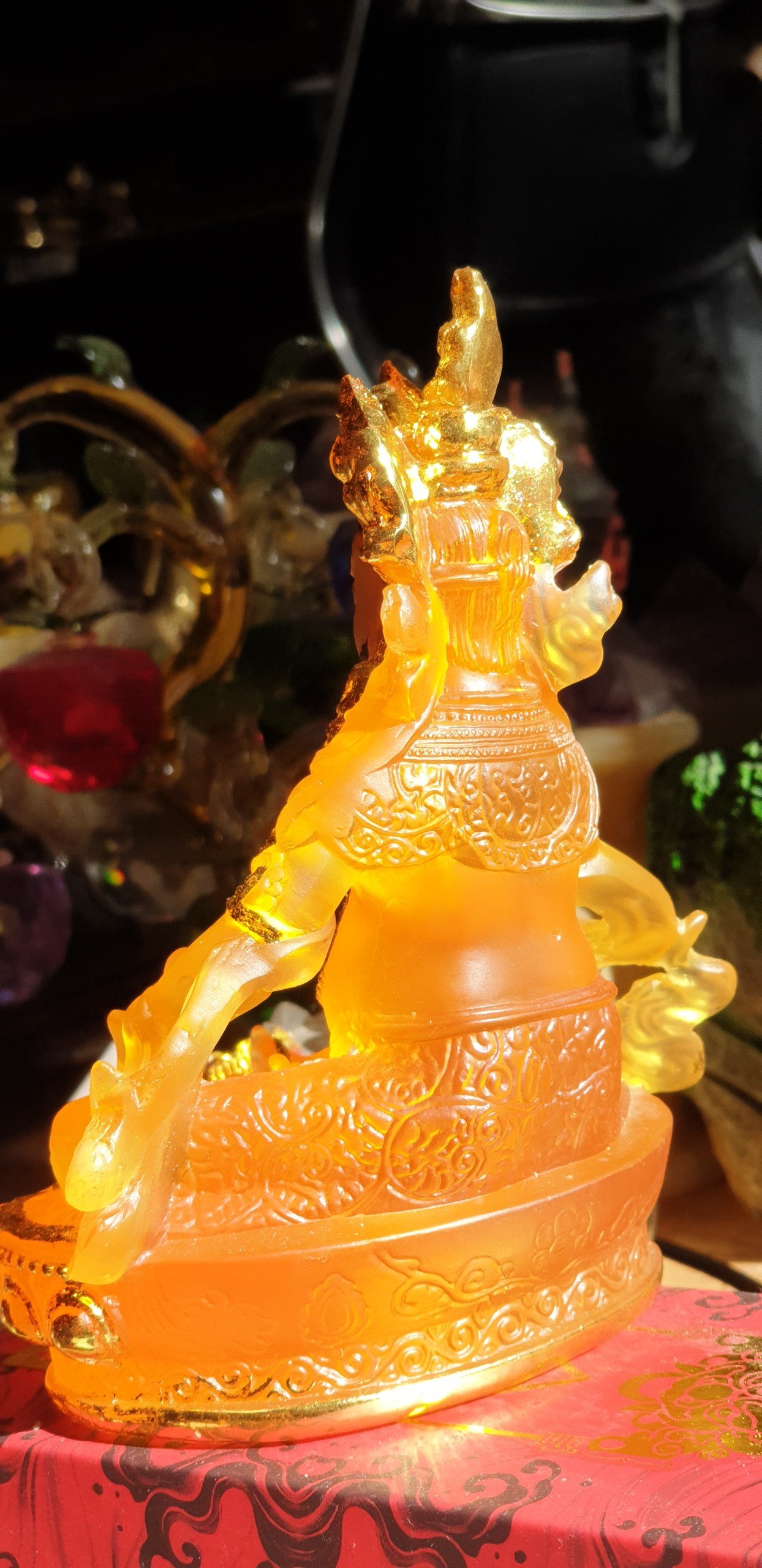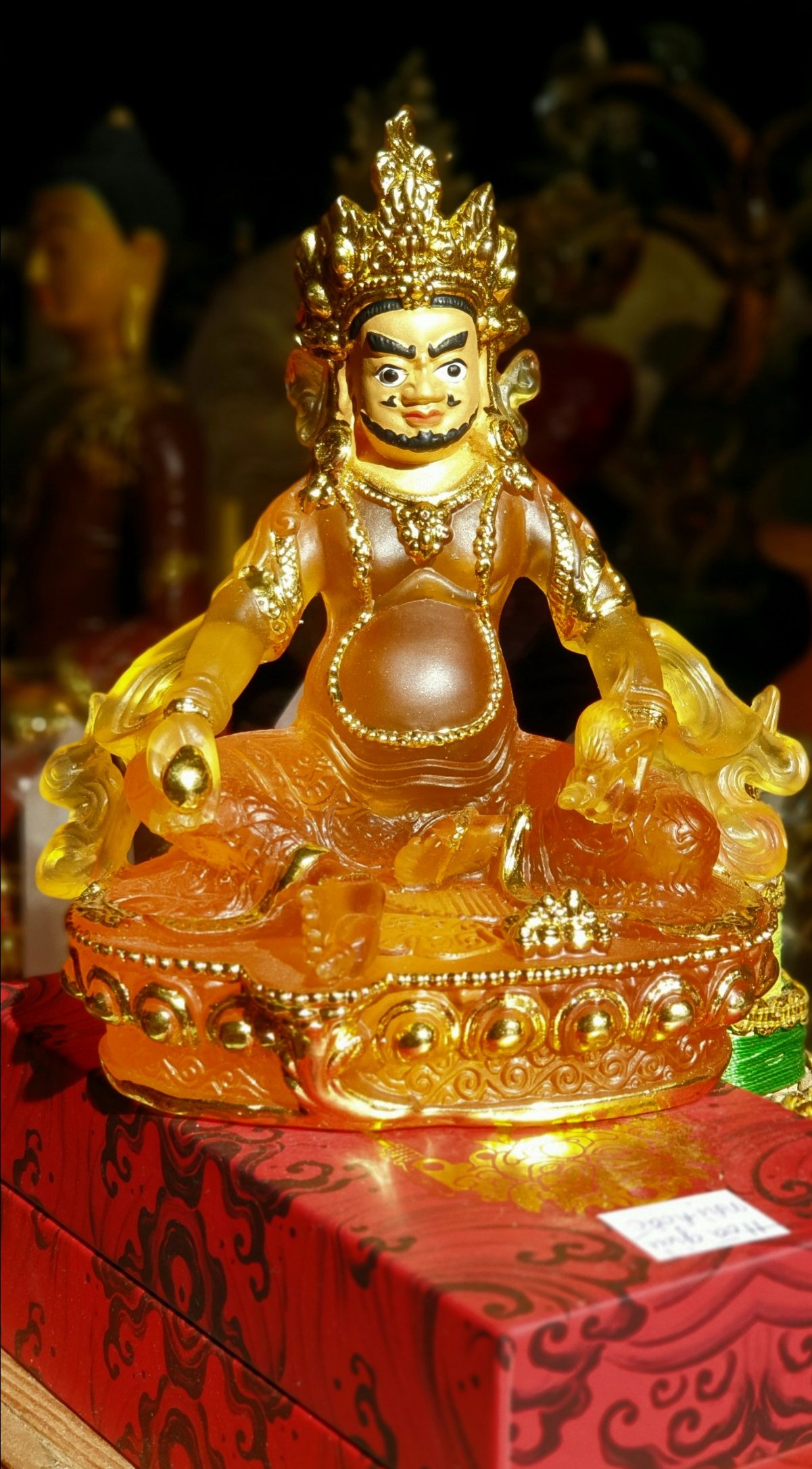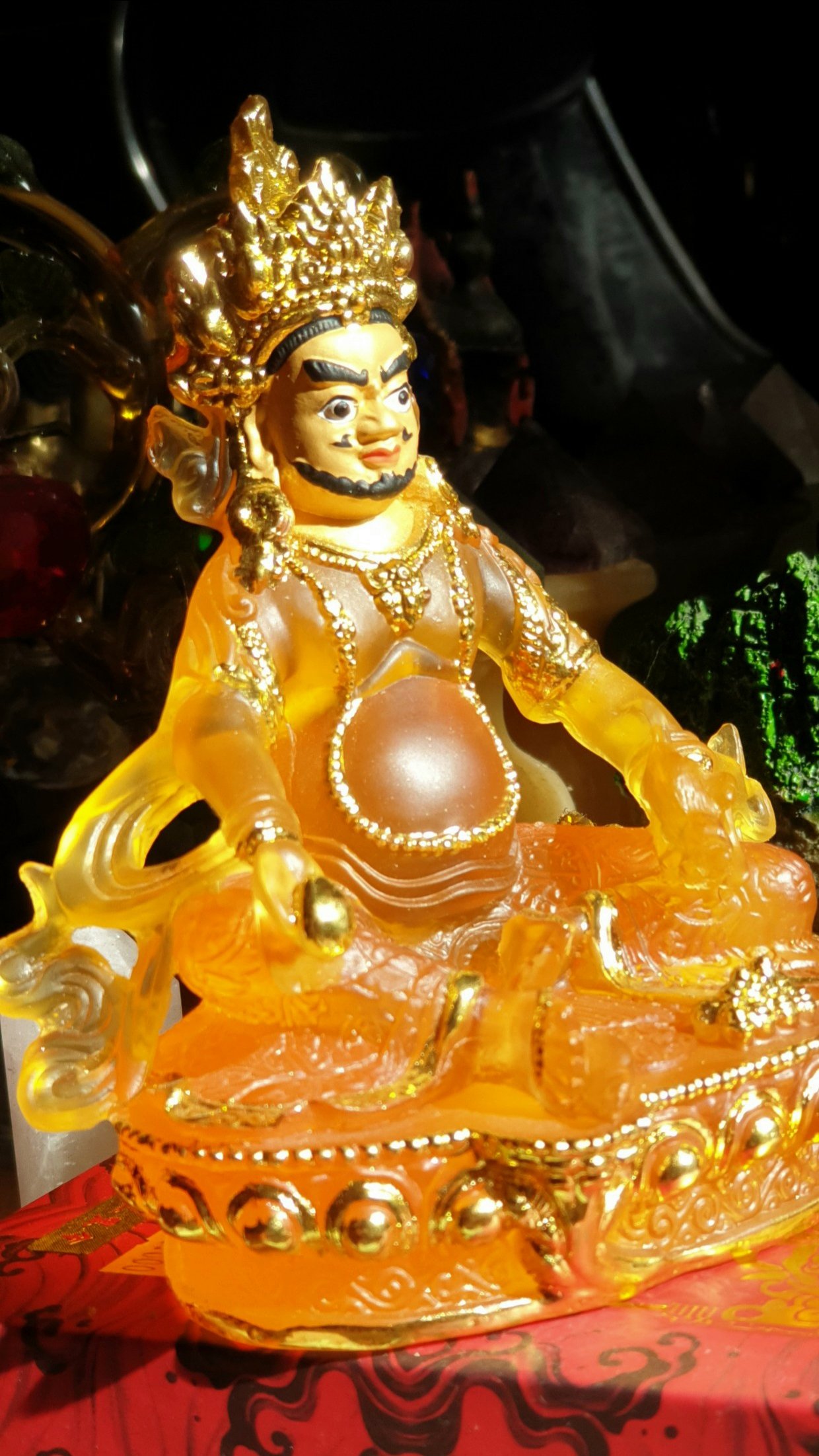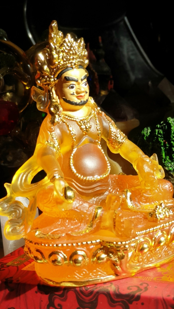 Đức Jambala (còn được gọi là Dzambala) là vị thần Tài Bảo và là một thành viên của gia đình Châu Báu (Bảo Bộ). Ngài được tin tưởng là một hóa thân của Quan Thế Âm, vị Phật của Lòng Bi Mẫn, hiện lộ là vị Phật ban phát tài bảo. Về sự hóa hiện của Quan Thế Âm, câu chuyện được khởi nguồn từ Lama Atisha, là một Lama đức cao vọng trọng của dòng truyền Gelug, khi ngài đang bộ hành ở Bồ Đề Đạo Tràng thì gặp một cụ già đang chết vì đói. Lama Atisha rất buồn vì sự thống khổ của cụ già. Lama Atisha lại không có dù chỉ là một chút thức ăn để bố thí cho cụ già, vì thế nên ngài lập tức cắt thịt của ngài để bố thí cho cụ già. “Làm sao tôi có thể ăn thịt của một vị tăng?” cụ già từ chối ăn miếng thịt đó. Lama Atisha đặt miếng thịt xuống, cảm thấy buồn và vô dụng quá thì một ánh sáng đột nhiên xuất hiện trước ngài. Đó là Thiên Thủ Thiên Nhãn Quan Thế Âm Bồ Tát, nói với Atisha: “Ta sẽ hóa hiện thành Jambhala, vị Phật của Tài bảo nhằm giúp đỡ những chúng sinh đau khổ. Ta sẽ làm vơi đi sự nghèo khổ để họ sẽ không còn bị sao lãng khỏi thực hành về thiện tâm.”