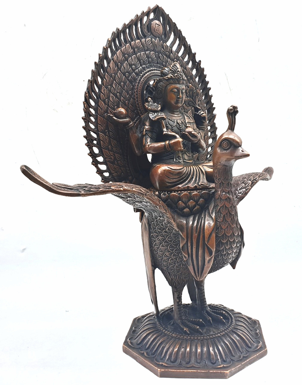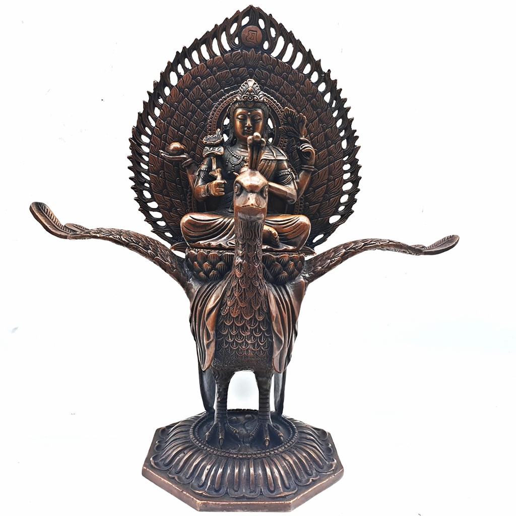 Đức Khổng Tước Minh Vương là một trong những hoá thân của Đức Phật A Di Đà. Ngài có thân màu trắng, mặc áo lụa trắng mỏng, đầu đội mão báu, cổ đeo dây ngọc, hoa tai, cánh tay đeo vòng xuyến, các thứ trang nghiêm, cưỡi trên Khổng Tước Vương màu vàng ròng, ngồi kiết già trên hoa sen trắng, trụ tướng Từ bi có bốn cánh tay:
