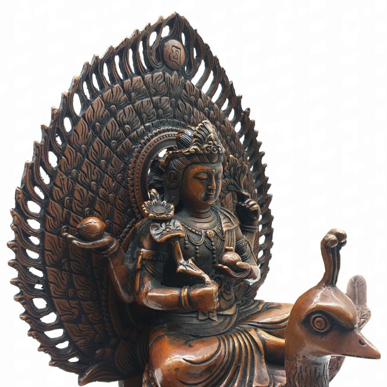 Bên trái: tay thứ nhất cầm Cát Tường Quả tượng trưng cho tăng ích, tay thứ hai cầm ba cái lông đuôi chim công tượng trưng cho sự trừ tai ách, diệt khổ nạn.