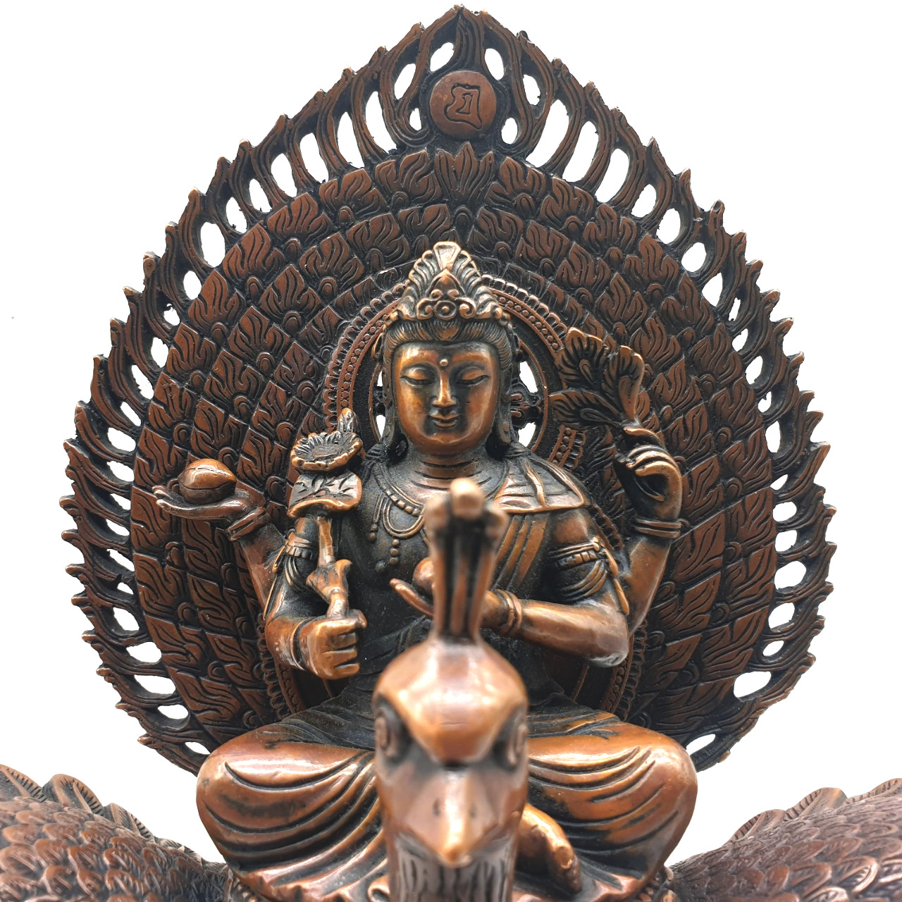 Khổng Tước Minh Vương tiêu diệt ba độc tham – sân – si của tất cả chúng sinh làm điều ác, ăn nuốt tất cả trùng độc để nuôi mạng sống, tức tượng trưng cho Minh Vương chặt đứt tất cả phiền não ác độc, sống lâu chẳng bị hoại thọ mệnh. Còn đuôi công lại hay phủi trừ vô lượng tai ách, tăng phước, đạt được các điều tốt lành và thành tựu mọi ước nguyện của chúng sinh.
