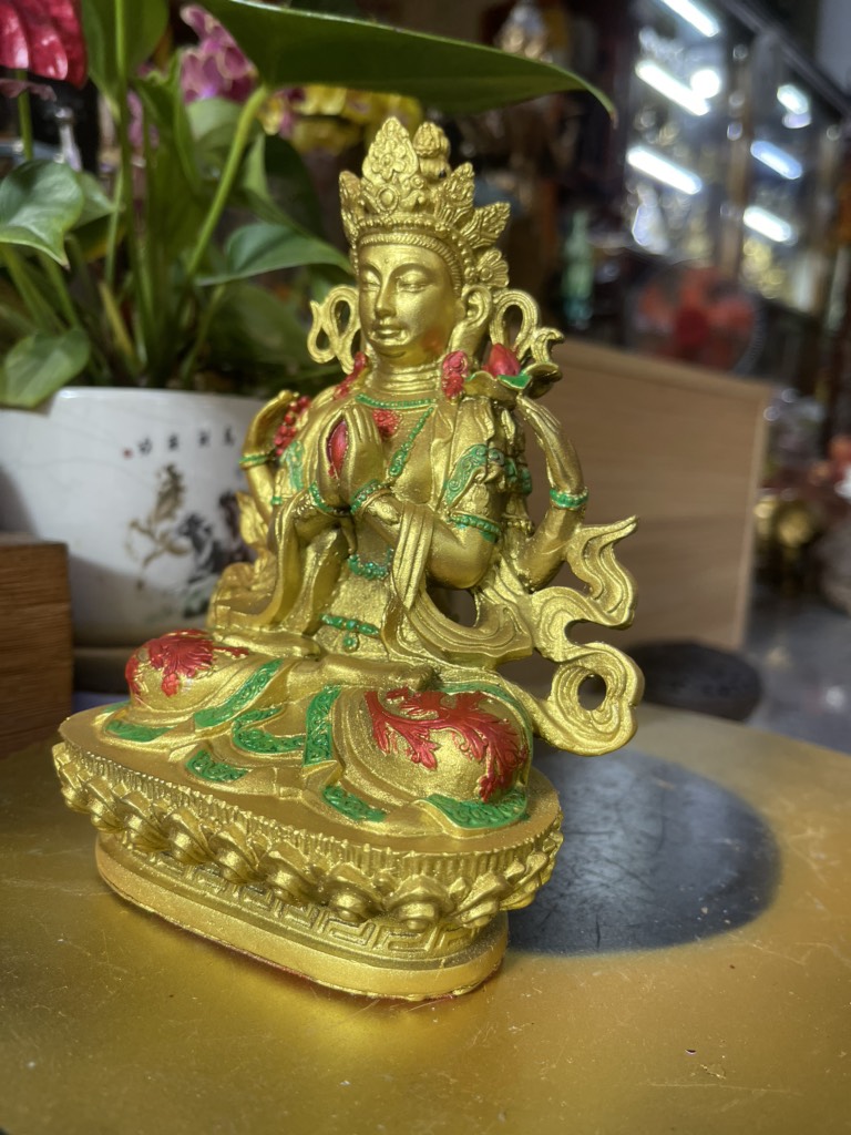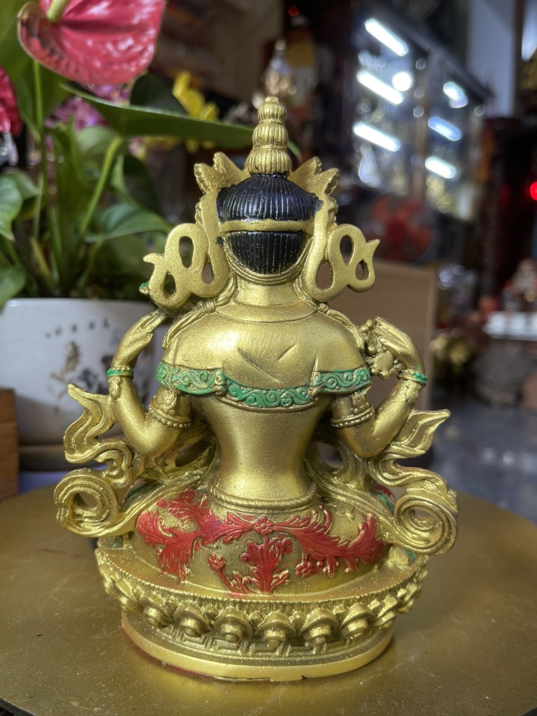 Đức Quan Âm là hiện thân vô ngại của sự thanh tịnh thuần khiết, của lòng từ bi, tình yêu thương và trí tuệ với bản nguyện khai mở, hiển lộ Bồ đề tâm và công đức đại bi sẵn có nơi tâm tất cả hữu tình. Ngài được mô tả trong sắc thân trong suốt rạng ngời, an tọa trên tòa sen trắng và đĩa mặt trăng, mỉm cười trong tình yêu thương bình đẳng, hướng cặp mắt từ bi diệu vợi với năng lực chữa lành hướng về chúng sinh. Ngài an tọa trong tư thế Kim Cương thể hiện tính nhất như của sinh tử và Niết bàn, trang sức các thiên y lụa là trang hoàng quý báu nêu biểu cho tất cả phẩm hạnh giác ngộ, áo da thú trên vai thể hiện hạnh nguyện nhập thế. Đức Quan Âm Tứ Thủ có một mặt bốn tay nêu biểu sự chứng ngộ Tứ vô lượng Tâm, hai tay phía trước trì giữ ngọc Như ý Mani, tay phải thứ hai cầm tràng pha lê, tay trái thứ hai trì giữ hoa sen. Hai tay phía trước kết ấn Liên hoa trì giữ ngọc Như ý thể hiện năng lực của lòng từ bi và trí tuệ hiểu biết có thể viên mãn mọi tâm nguyện của chúng sinh, giúp mọi ước nguyện thế gian và xuất thế gian đều được vẹn toàn như ý. Tay phải thứ hai cầm tràng pha lê nêu biểu sự liên tục cứu giúp chúng sinh mà không bỏ xót một ai, và chuỗi tràng cũng nêu biểu chân ngôn của Ngài. Trong khi tay trái thứ hai cầm hoa sen nêu biểu Bồ đề tâm thanh tịnh dù ứng hiện thân vào các cõi luân hồi nhiễm ô để cứu giúp chúng sinh, nhưng Ngài vẫn thanh tịnh vô nhiễm như hoa sen mọc trong bùn. Tất cả đặc điểm trong hình ảnh đức Quan Âm là nêu biểu những hạnh đức, thần lực và công hạnh Ba la mật vi diệu của Ngài.