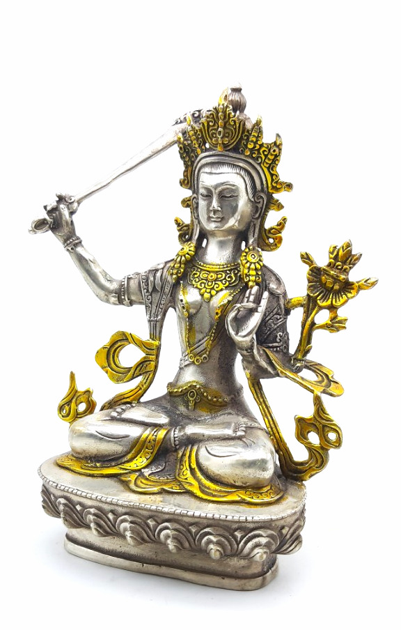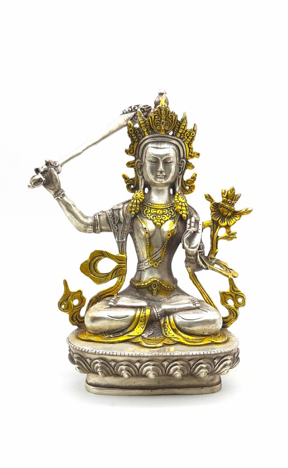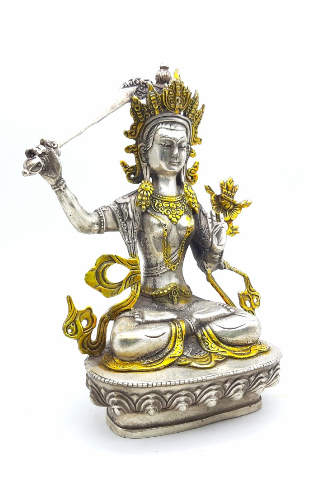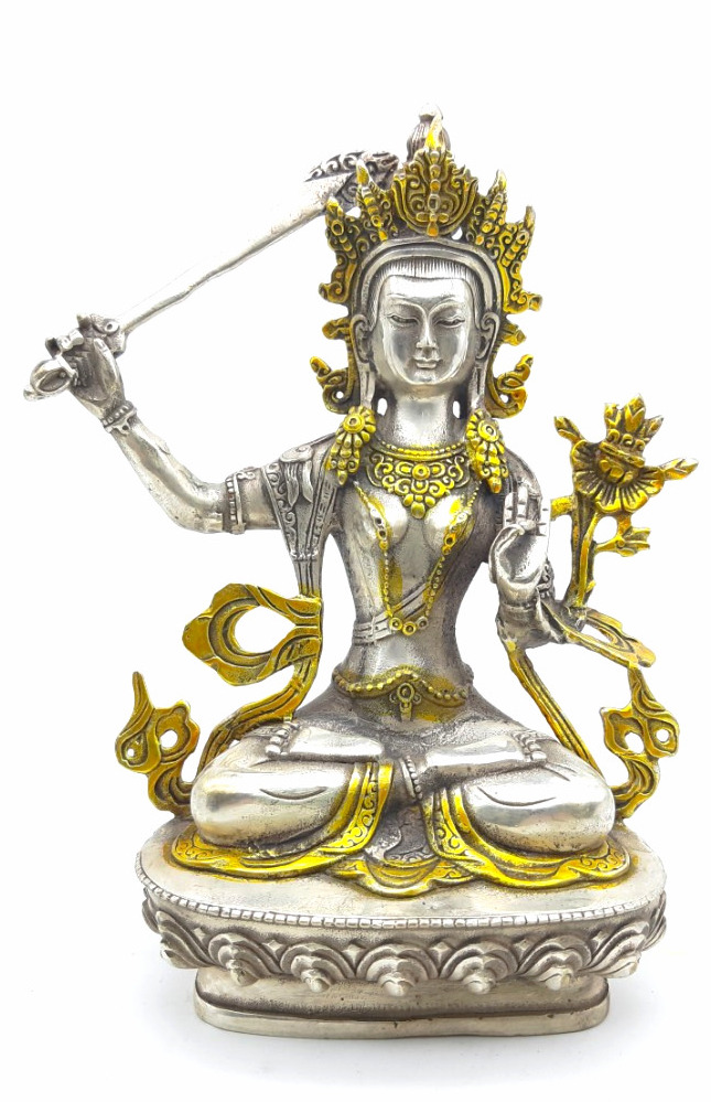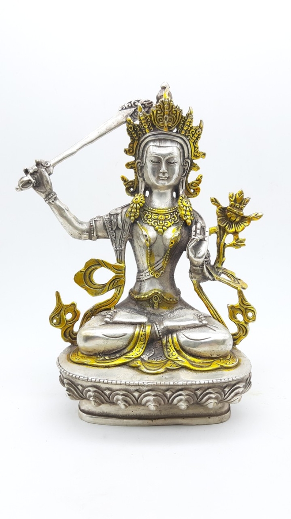 Văn Thù Sư Lợi Bồ Tát cũng được gọi là Mạn Thù Thất lỵ, có nghĩa là Diệu Đức, Diệu Cát Tường. Diệu Đức được hiểu là mọi đức đều tròn đầy. Thủa xưa, Ngài là con thứ ba của vua Vô Trách Nhiệm có tên là Thái tử Vương Chúng. Ngài cúng dường Phật Bảo Tạng và phát nguyện độ sinh nên được hiệu là Văn Thù Sư Lợi. Sau khi Phật Bảo Tạng thọ ký cho Ngài phải trải vô lượng hằng hà sa số kiếp về sau, thì Ngài sẽ thành Phật ở thế giới thanh tịnh Vô Cấu Bảo Chi thuộc về bên phương Nam, hiệu là Phật Văn Thù. Bồ Tát Văn Thù Sư Lợi xuất hiện hầu như trong tất cả các kinh điển quan trọng của Phật giáo Đại thừa: Hoa Nghiêm, Thủ Lăng Nghiêm, Pháp Hoa, Duy Ma Cật…như là một nhân vật thân cận nhất của Đức Phật Thích Ca.