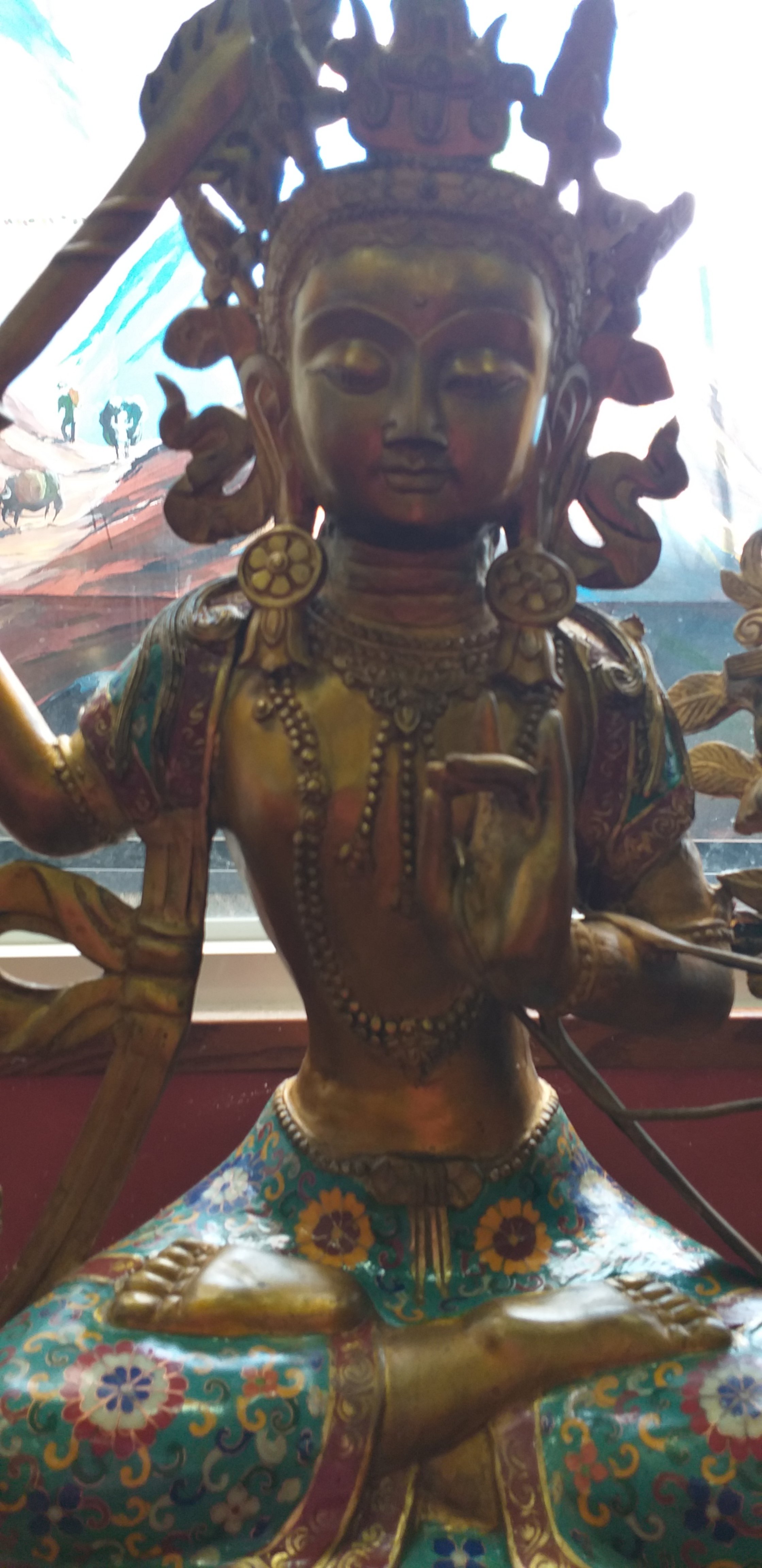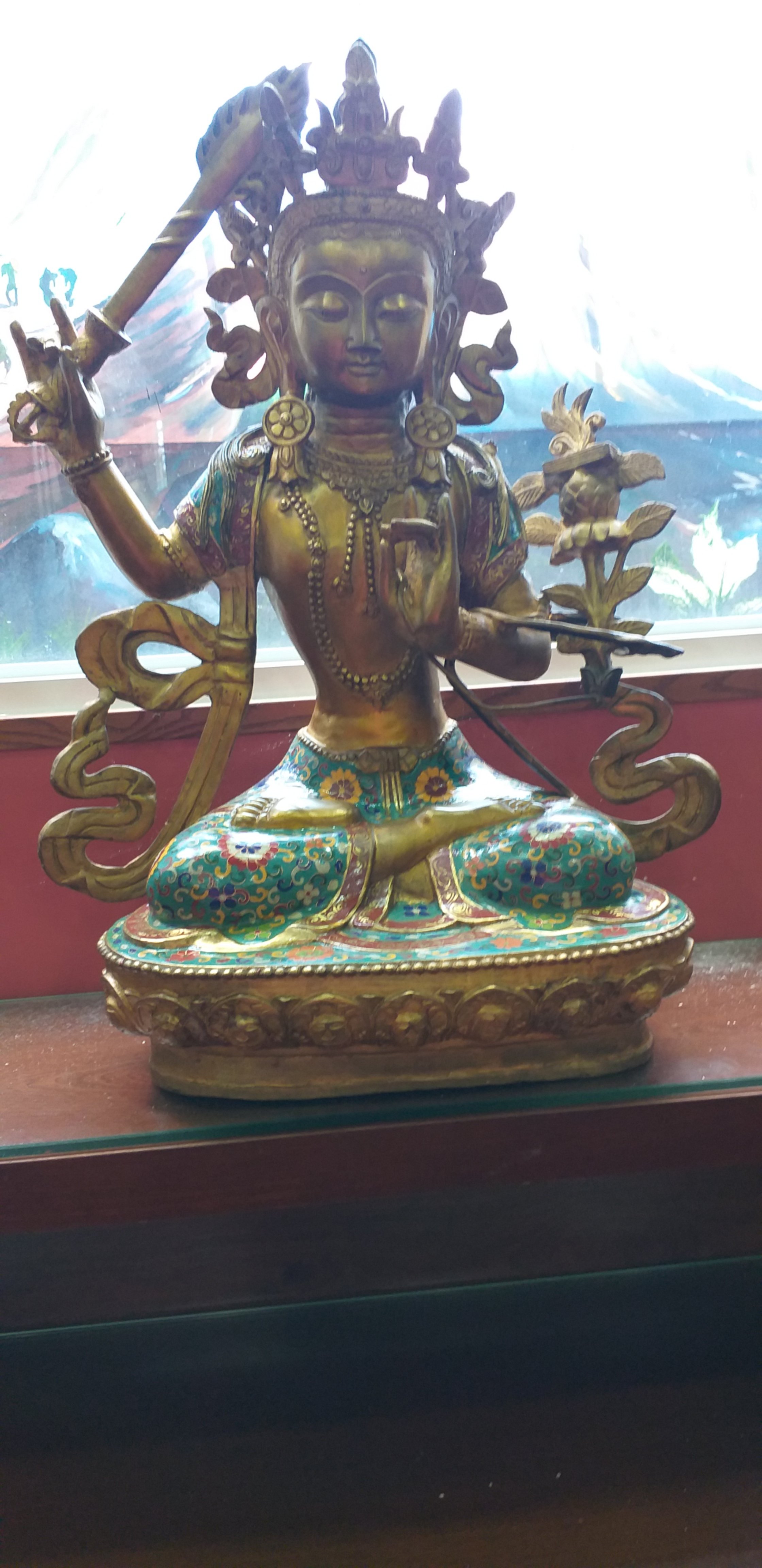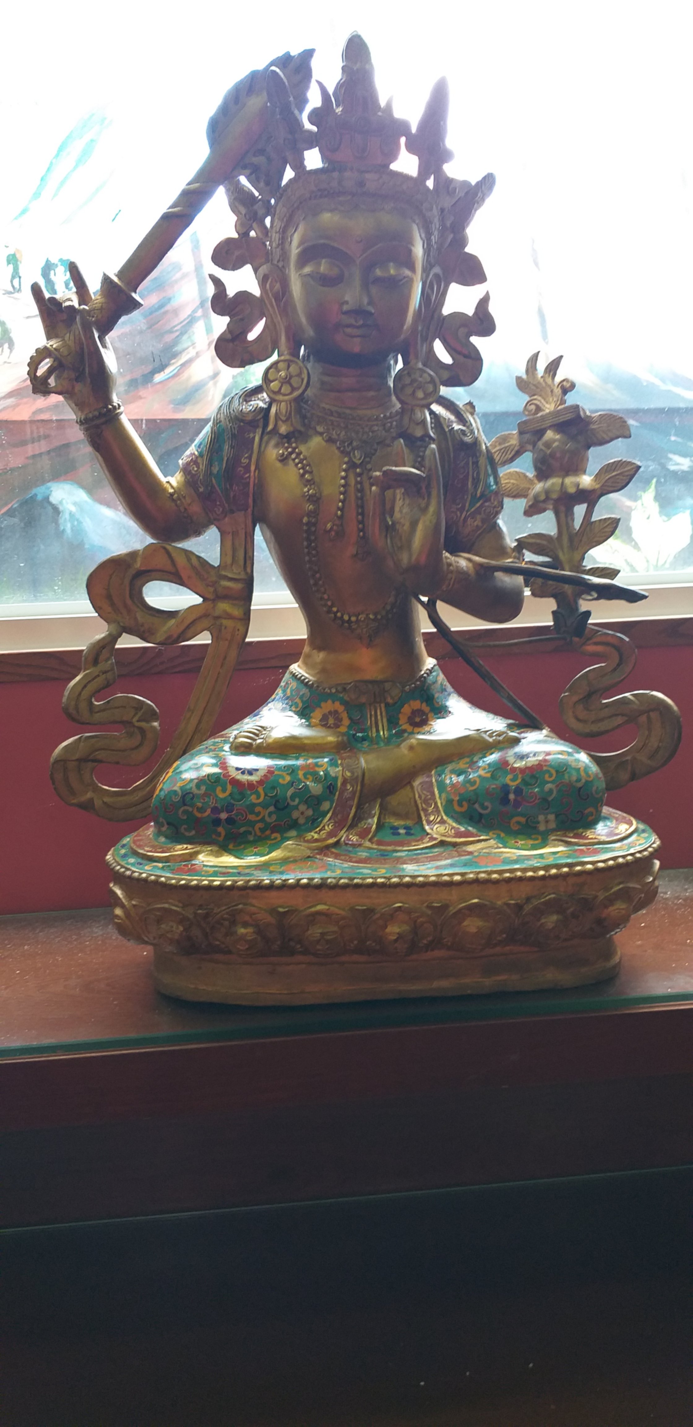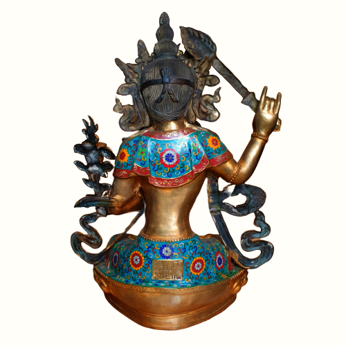 Trong khi đó, tay trái của Ngài đang cầm giữ cuốn kinh Bát nhã trong tư thế như ôm ấp vào giữa trái tim. Đây là biểu trưng cho tỉnh thức, giác ngộ. Đôi khi, chúng ta cũng thấy tay trái của Ngài cầm hoa sen xanh, biểu thị cho đoạn đức. Có nghĩa là dùng trí tuệ để dứt sạch mọi nhiễm ô tham ái, như hoa sen ở trong bùn mà không nhiễm mùi bùn. Nói một cách khác là Bồ tát không phải người ẩn nơi non cao rừng thẩm, hoặc sống trong cảnh thanh tịnh u nhàn, mà là người sống chung đụng với quần chúng, lăn lộn trong đám bụi trần để cứu độ chúng sinh, nên có lúc họ ra làm vua, có lúc làm quan, cũng có khi làm kẻ tật nguyền nghèo khổ…Tuy sống trong dục lạc dẫy đầy, mà Bồ tát vẫn giữ tâm thanh tịnh không bị ô nhiễm như người đời. Đó là nhờ trí tuệ dứt sạch tham ái, viên thành đoạn đức.