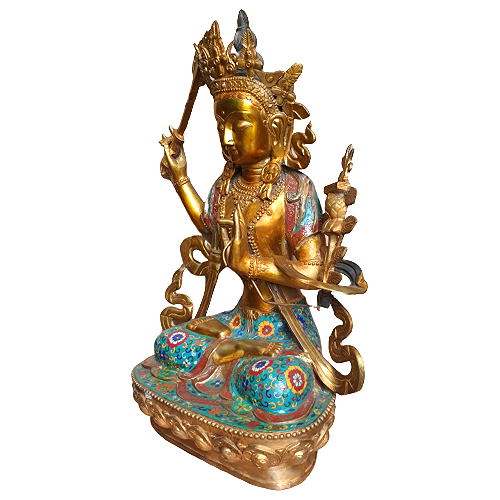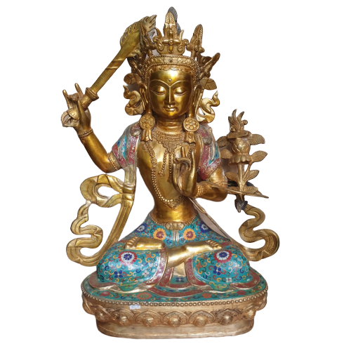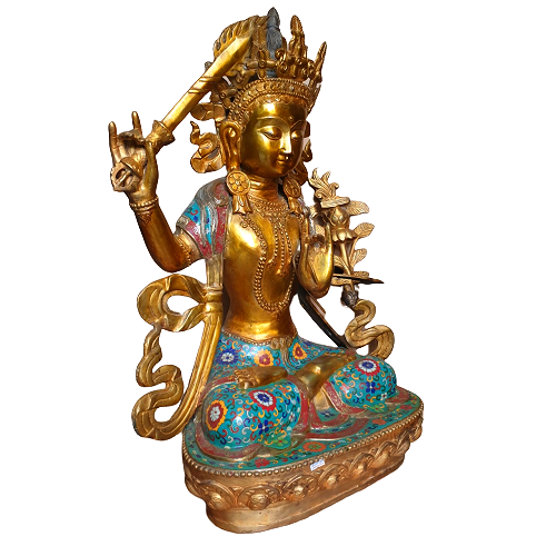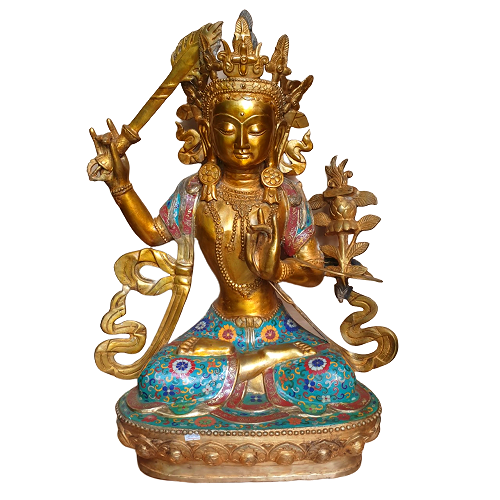 Văn Thù Sư Lợi Bồ Tát cũng được gọi là Mạn Thù Thất lỵ, có nghĩa là Diệu Đức, Diệu Cát Tường. Diệu Đức được hiểu là mọi đức đều tròn đầy. Thủa xưa, Ngài là con thứ ba của vua Vô Trách Nhiệm có tên là Thái tử Vương Chúng. Ngài cúng dường Phật Bảo Tạng và phát nguyện độ sinh nên được hiệu là Văn Thù Sư Lợi. Sau khi Phật Bảo Tạng thọ ký cho Ngài phải trải vô lượng hằng hà sa số kiếp về sau, thì Ngài sẽ thành Phật ở thế giới thanh tịnh Vô Cấu Bảo Chi thuộc về bên phương Nam, hiệu là Phật Văn Thù. Bồ Tát Văn Thù Sư Lợi xuất hiện hầu như trong tất cả các kinh điển quan trọng của Phật giáo Đại thừa: Hoa Nghiêm, Thủ Lăng Nghiêm, Pháp Hoa, Duy Ma Cật…như là một nhân vật thân cận nhất của Đức Phật Thích Ca.