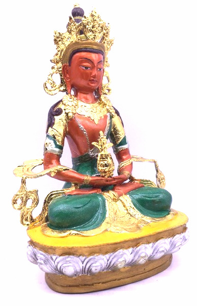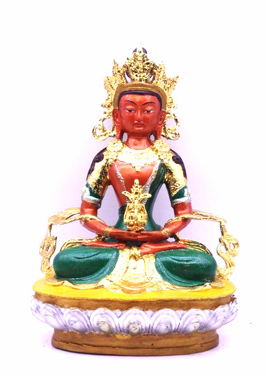 Đức Phật Vô Lượng Thọ trí tuệ thù thắng, một mặt, hai tay trong tư thế kết ấn thiền định. Trên lòng hai tay có bảo bình tràn đầy cam lồ bất tử. Thân Ngài sắc đỏ nêu biểu Đại hỷ lạc. Ngài có ba mươi hai tướng tốt và tám mươi vẻ đẹp, trang hoàng bằng thiên y, tua lụa, bảo báu rực rỡ trong hình tướng Báo thân Phật.